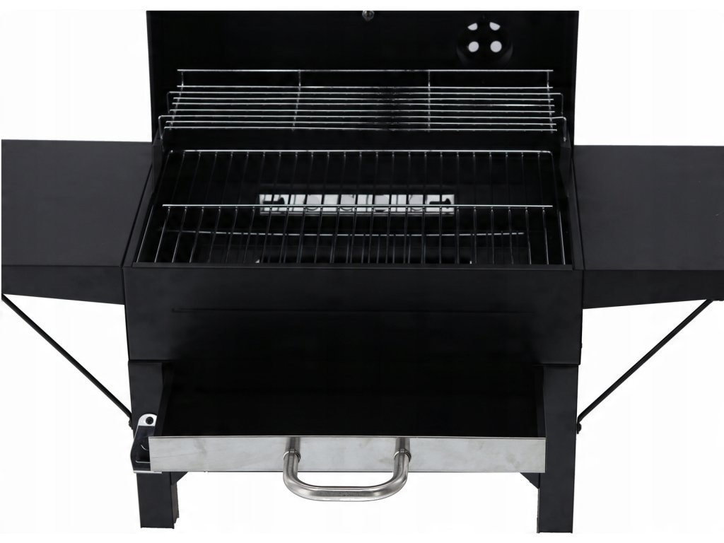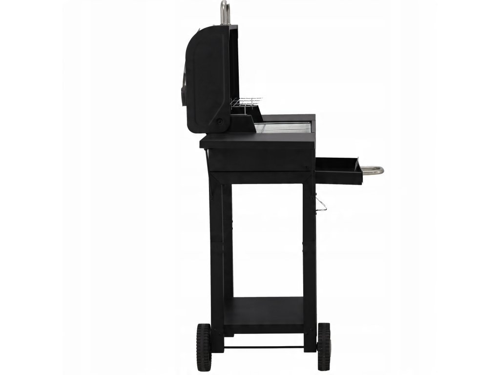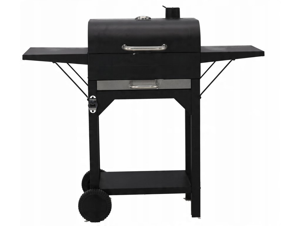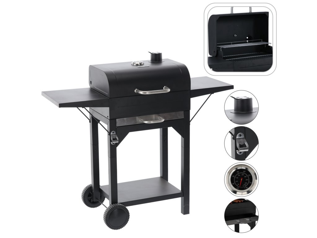 Žar na lesnem oglju s pokrovom, rešetko in kolesci, izdelan iz visoko kakovostnega ogljikovega jekla, idealen za žar na prostem. Vsebuje funkcionalno dodatno opremo, vključno s termometrom, posodo za pepel in stranskima policama.