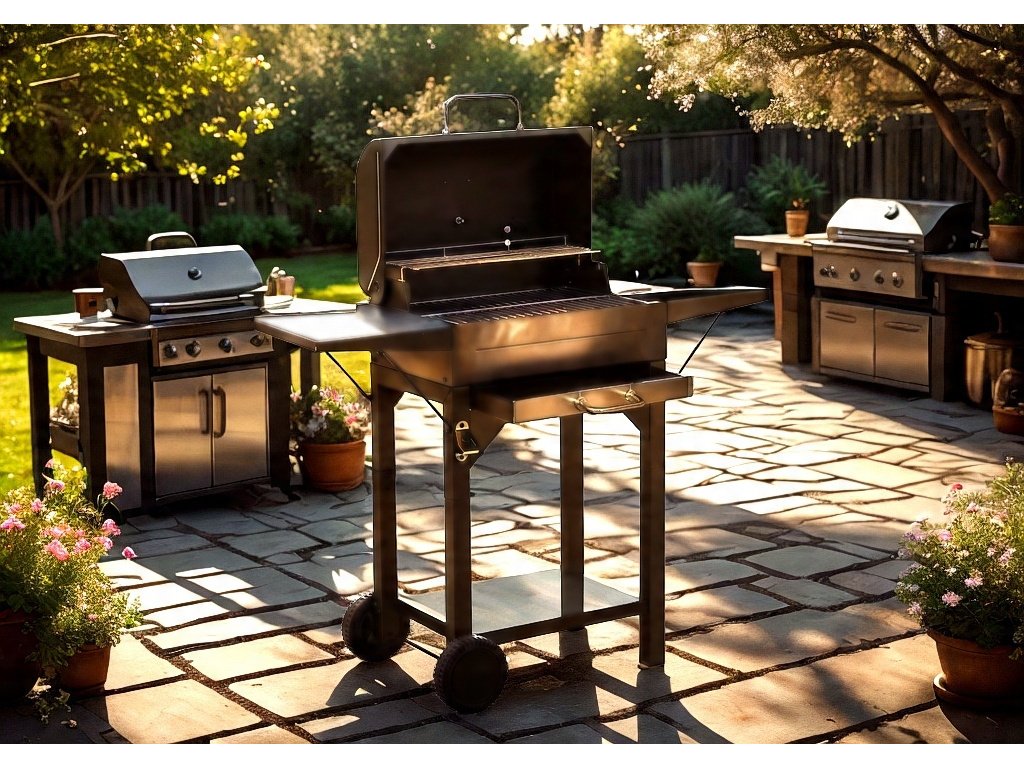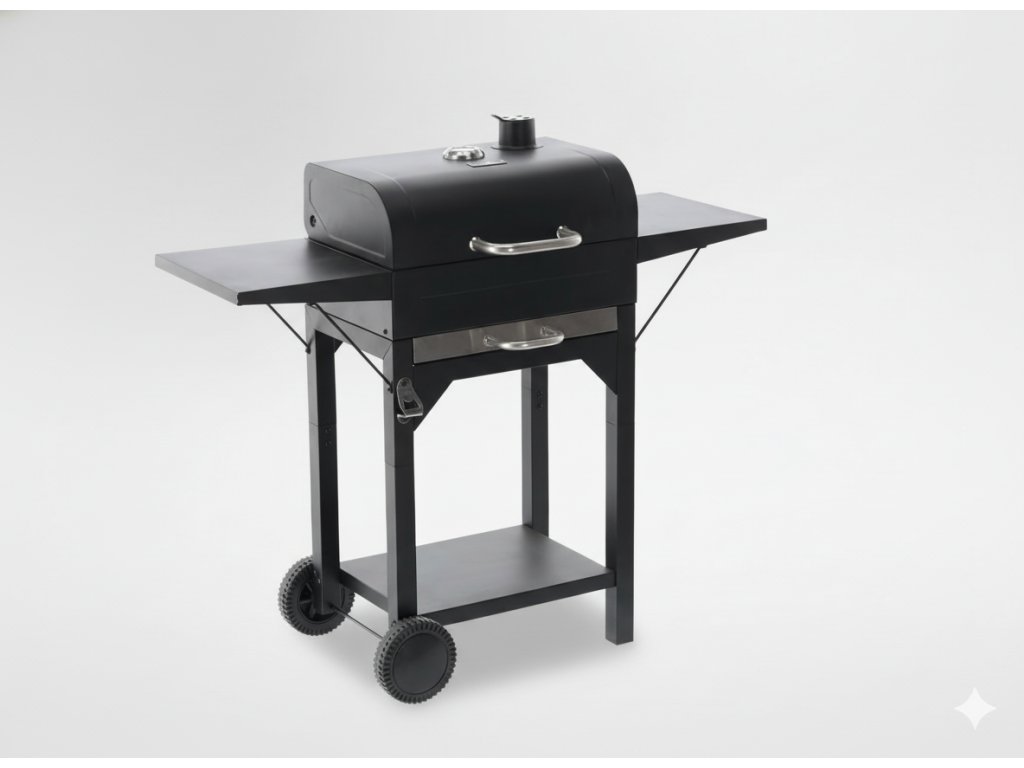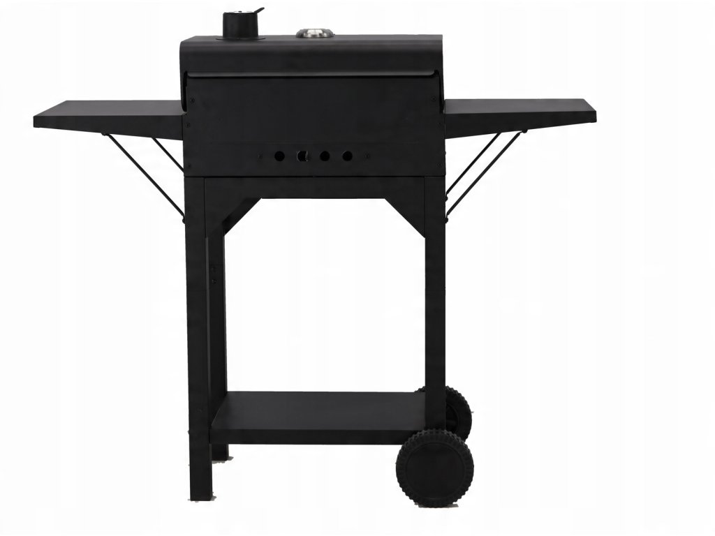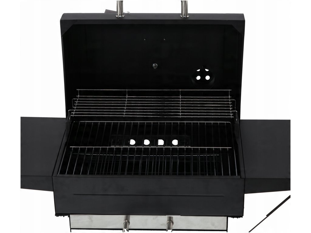 Žar na lesnem oglju s pokrovom, rešetko in kolesci, izdelan iz visoko kakovostnega ogljikovega jekla, idealen za žar na prostem. Vsebuje funkcionalno dodatno opremo, vključno s termometrom, posodo za pepel in stranskima policama.