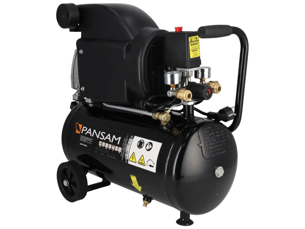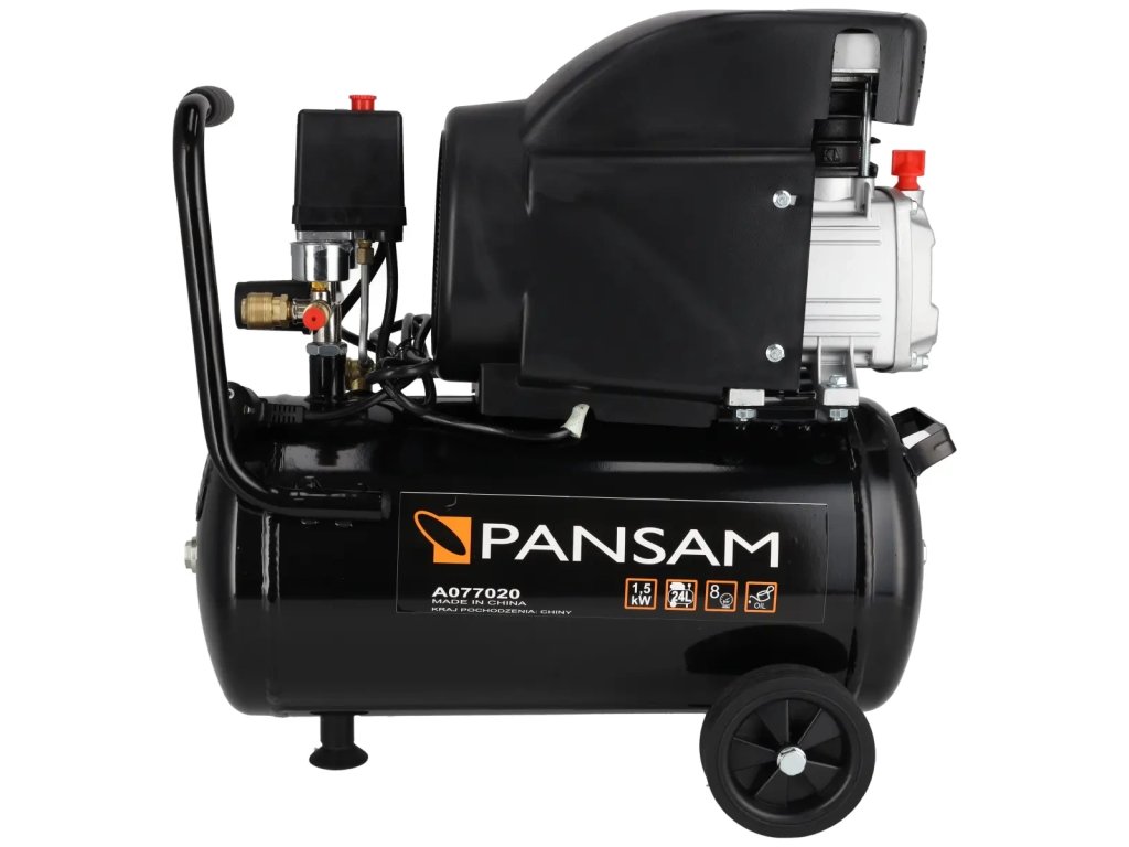Oljni kompresor A077020 je namenjen za stiskanje atmosferskega zraka in se z ustrezno opremo lahko uporablja za pihanje, čiščenje, pranje, polnjenje pnevmatik, lakiranje itd. Kompresor ima motor z močjo 1500 W in 24-litrski rezervoar. Velika transportna kolesa omogočajo hitro in enostavno transportiranje kompresorja. Kompresor je opremljen z dvema manometroma in dvema priključnima odprtinama, kar povečuje učinkovitost kompresorja.Lastnosti naprave PANSAM A077020: