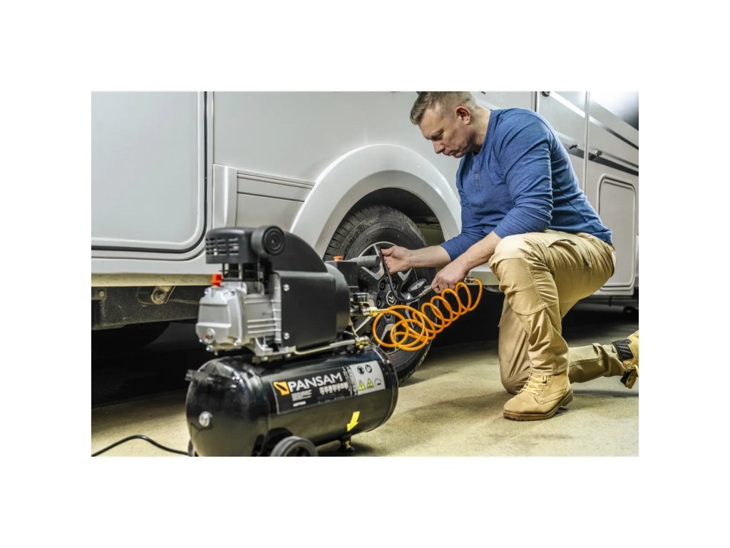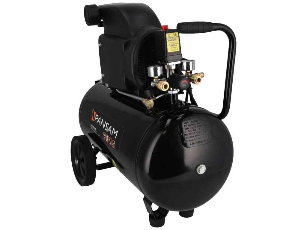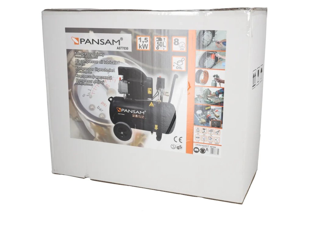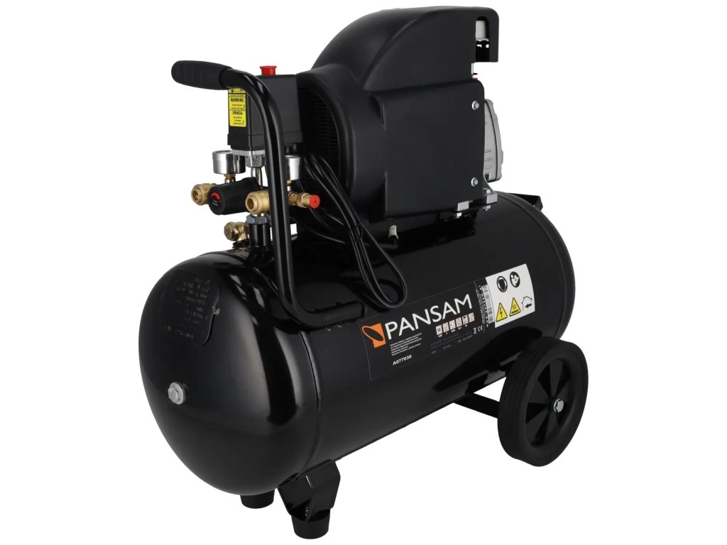 Oljni kompresor A077030 je namenjen stiskanju atmosferskega zraka in se z ustrezno opremo lahko uporablja za pihanje, čiščenje, pranje, polnjenje koles, barvanje itd. Kompresor ima motor z močjo 1500 W in 24-litrski rezervoar. Velika transportna kolesa omogočajo hitro in enostavno transportiranje kompresorja. Kompresor je opremljen z dvema manometroma in dvema priključkoma, kar povečuje učinkovitost kompresorja. Lastnosti PANSAM A077030 kompresor:- Enovaljni motor