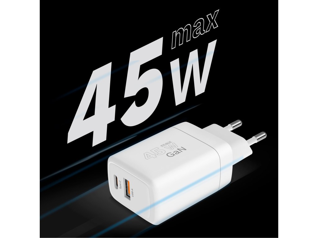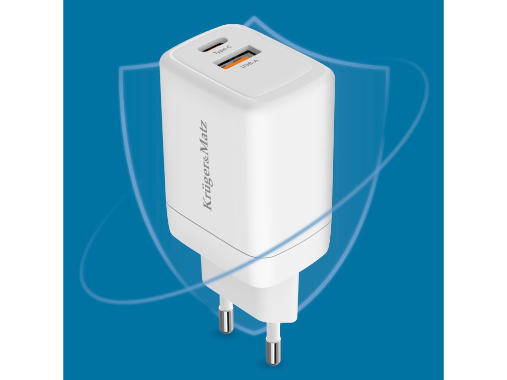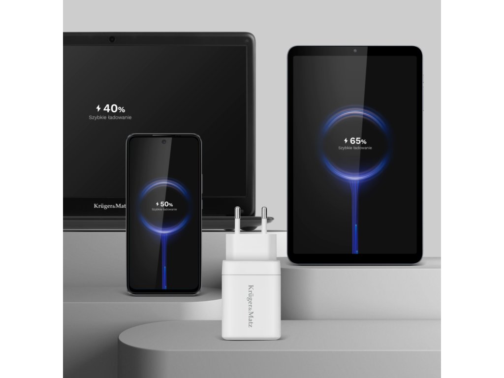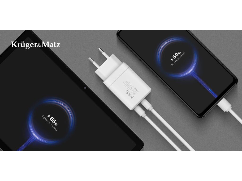 Z visoko močjo 45 W in tehnologijo Power Delivery ter Quick Charge polnilec omogoča hitro in učinkovito polnjenje vaših naprav, prilagajanje izhodne moči potrebam priključene opreme. Zaradi uporabe tehnologije GaN je USB polnilec Kruger&Matz bolj učinkovit in kompakten. Ta rešitev povečuje energetsko učinkovitost in zmanjšuje toploto, ki se oddaja med polnjenjem. Tako omogoča hitrejše polnjenje, ob tem pa ohranja majhne dimenzije in bistveno daljšo življenjsko dobo.