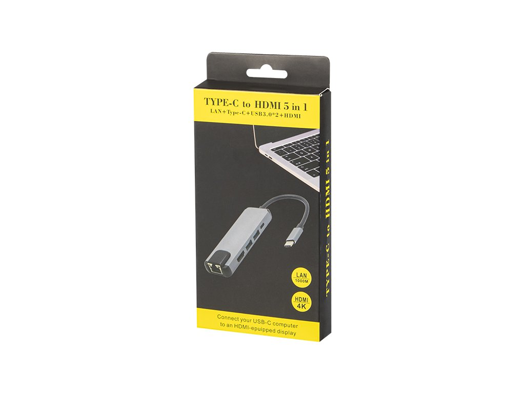 Zunanji omrežni kartični HUB z USB-C vtikačem ter vtičnicami RJ45, HDMI, USB tip C in dvema USB 3.0, namenjen predvsem za prenosnike blagovne znamke Apple (serija MacBook), Chromebook ter prenosnike z vhodom USB-C.