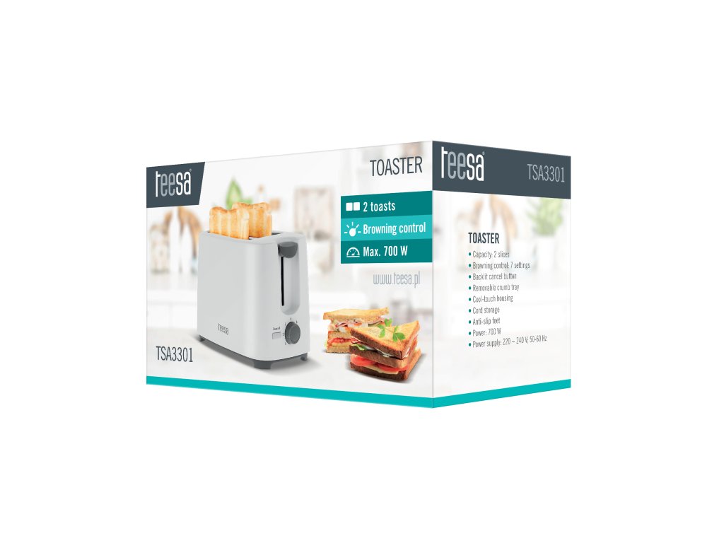 Teesa skrbi tudi za varnost, zato je ohišje toasterja izdelano iz materialov, ki se ne segrevajo, in je opremljeno z nedrsečimi nogicami, zaradi česar je varen za uporabo tudi za mlajše člane gospodinjstva. Med prednosti naprave zagotovo spada izvlečni pladenj za drobtine, ki močno olajša čiščenje, ter prostor za shranjevanje kabla, kar omogoča praktično shranjevanje toasterja s popolno estetiko.