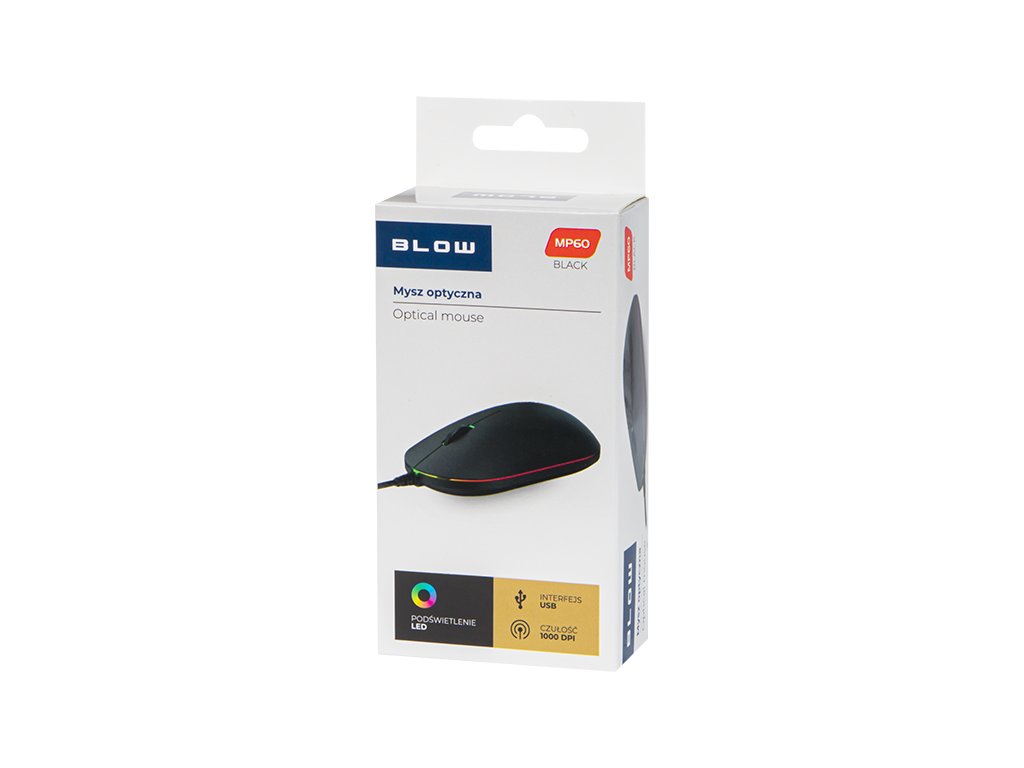 Miška BLOW MP-60, ki se ponaša z izjemnim dizajnom ter nežno barvno LED osvetlitvijo, je namenjena delu z večino operacijskih sistemov. Optična ločljivost 1000 DPI omogoča učinkovito in natančno delo na skoraj vsaki površini. Njena izdelava bo zadovoljila vsakega uporabnika - idealno bo delovala doma in v pisarni.
