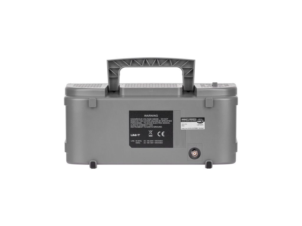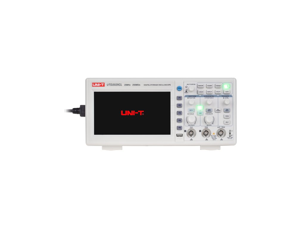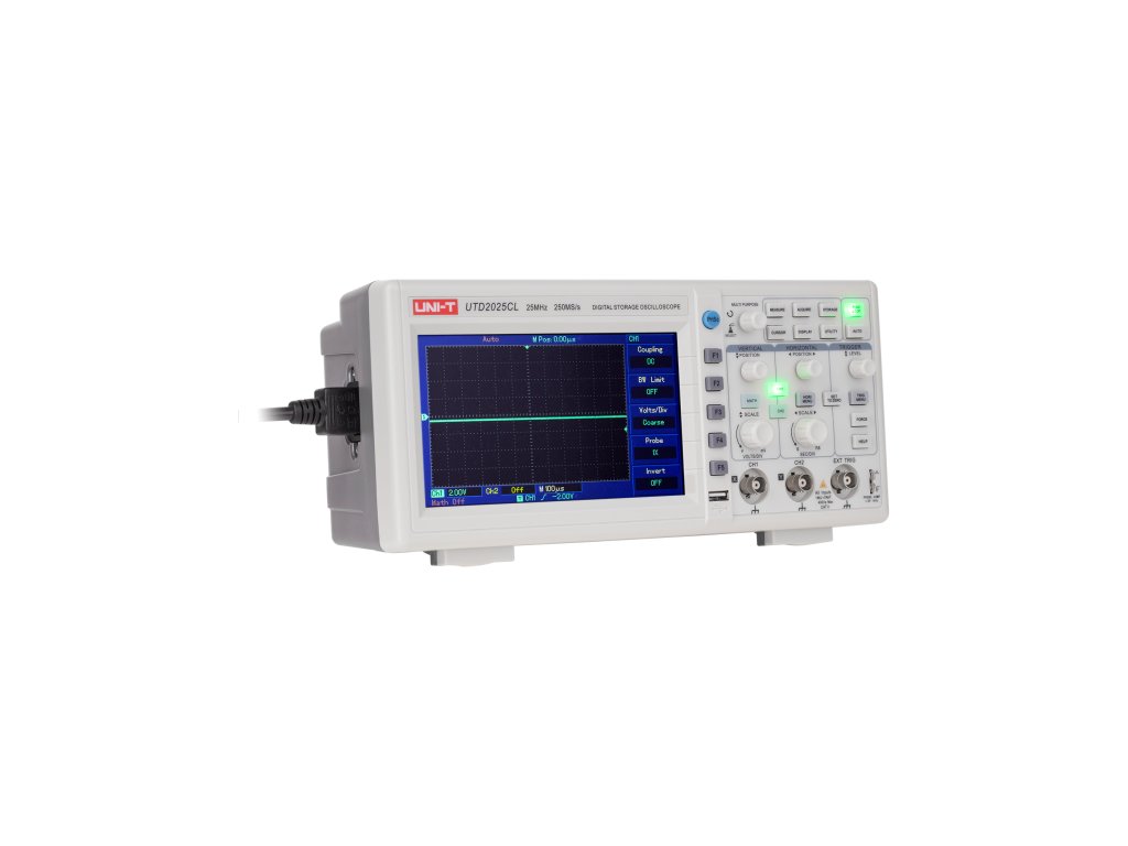 GLAVNI PARAMETRI Širina pasu: 25 MHz Število kanalov: 2 Vzorce vzorčenja: 250 MS/s Čas naraščanja: <14 ns Głębokość pamięci: 25 kpts Szybkość przechwytywania przebiegów: >2000 wfms/s Občutljivost navpičnega odklona: 1 mV/div ~ 20 V/div Natančnost meritve DC (pridobivanje s povprečenjem): ±(3% x odčitek + 0,1 div + 1 mV) Vhodna impedanca: 1 MOhm ±2%/24 pF ±3 pF Polarizacija: pozitivna/negativna Vhodna napetost: maks. 400 V (DC + AC vrh) Matematične operacije: seštevanje, odštevanje, množenje, deljenje, FFT Osnova časa: 10 ns/div ~ 50 s/div Shranjevanje merilnih podatkov: nastavitev, valovna oblika, bitna slika SPROŽILEC Števec frekvence: 6-mestni Vrste sproženj: robno, širina impulza, video signal, izmenično Viri sprožitve: CH1, CH2, Linija, EXT Obseg nivoja sprožitve: • notranji: ±8 div, šteje se od sredine zaslona • zunanji: ±3 V Razpon naraščanja mrtvega časa: 80 ns ~ 1,5 s Vrste robnih sprožitev: naraščajoče, padajoče, naraščajoče in padajoče Avtomatska nastavitev: Da Vrata: Izhod Pass/Fail, USB OTG SPLOŠNE ZNAČILNOSTI Napajanje: 100 ~ 240 V AC RMS, 50/60 Hz Zaslon: 7" TFT LCD, WVGA (400x240 pik) Teža: 2,2 kg Dimenzije: 306 x 147 x 122 mm Dodatki: 2x merilna sonda, napajalni kabel, USB kabel, CDGLAVNI PARAMETRI