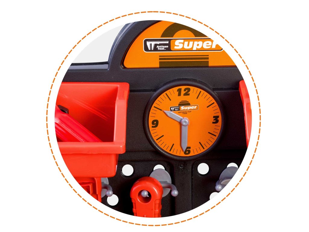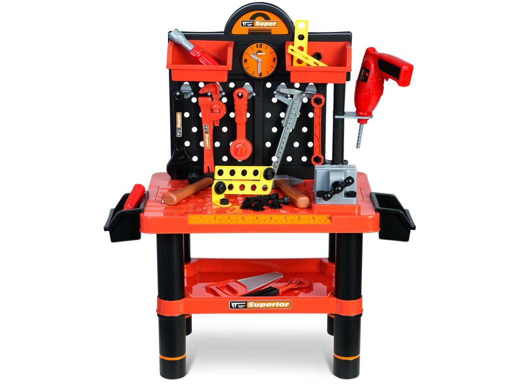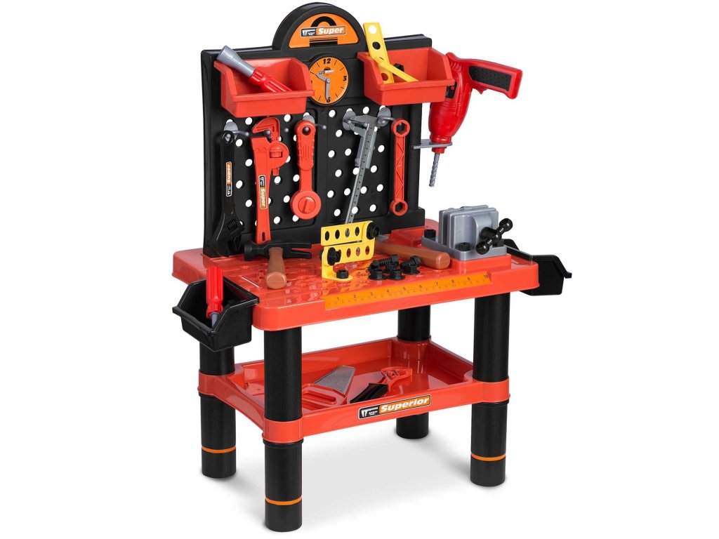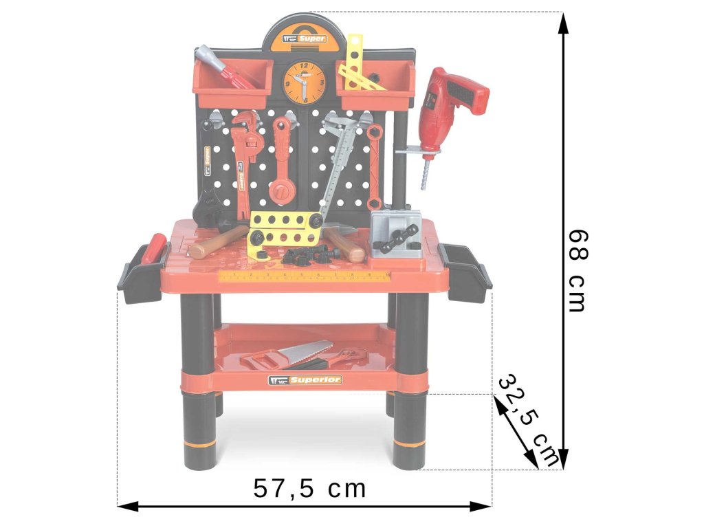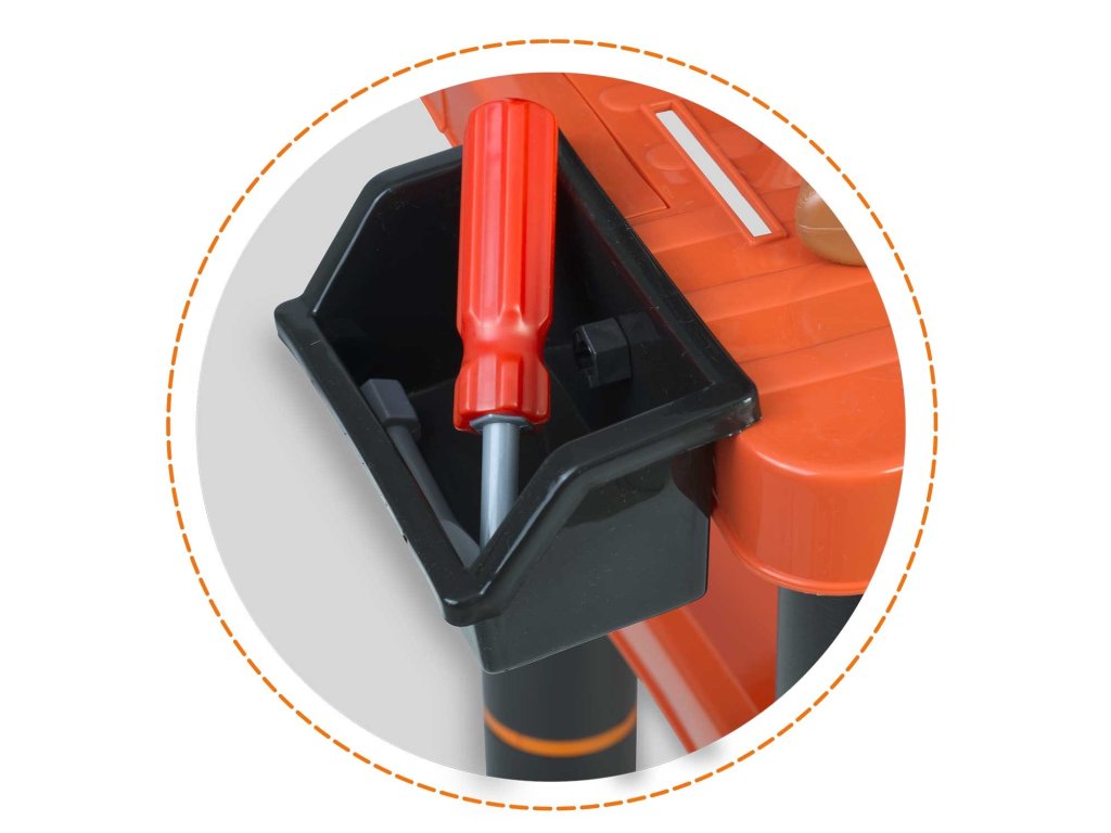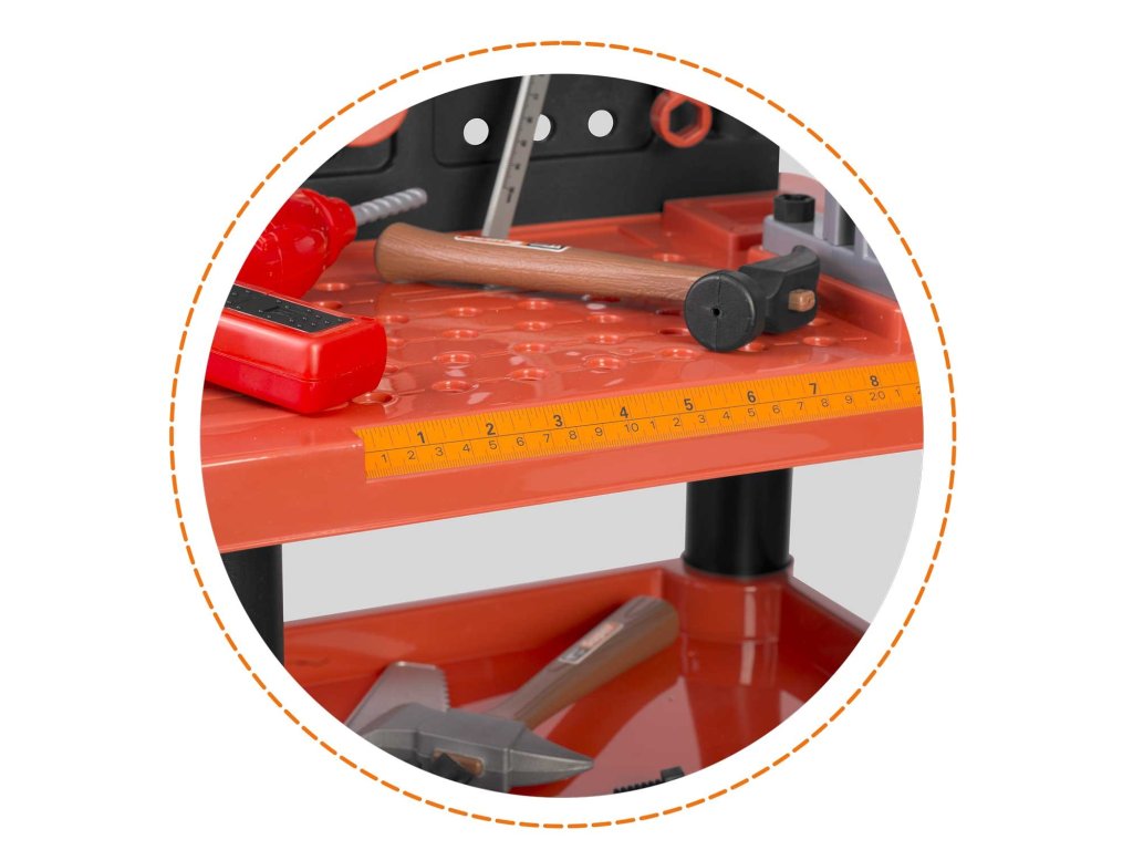 Predstavljamo delovno mizo za otroke opremljeno s policami in setom orodja, ki spominja na pravo, le iz materiala, ki ga je enostavno čistiti...
