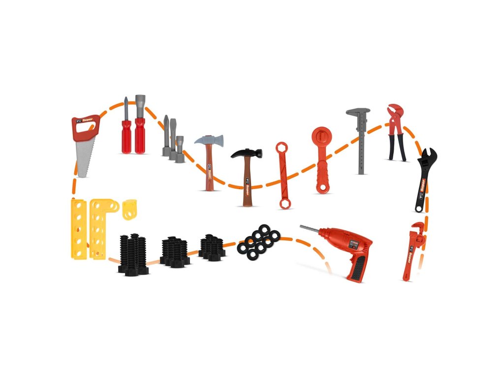 - številni dodatki (4 x ključi, kladivo, žaga, vijaki, izvijači, DIY trakovi, merilo),