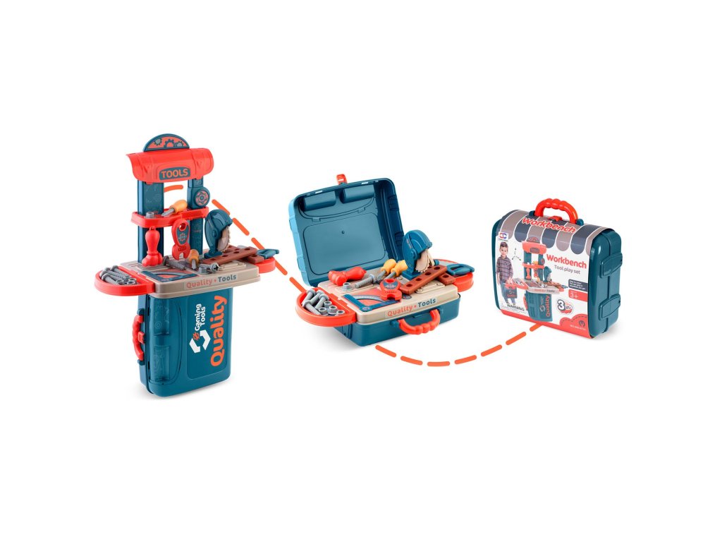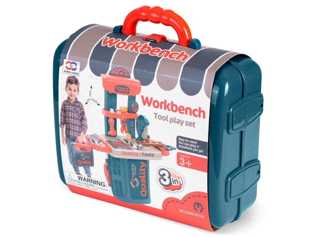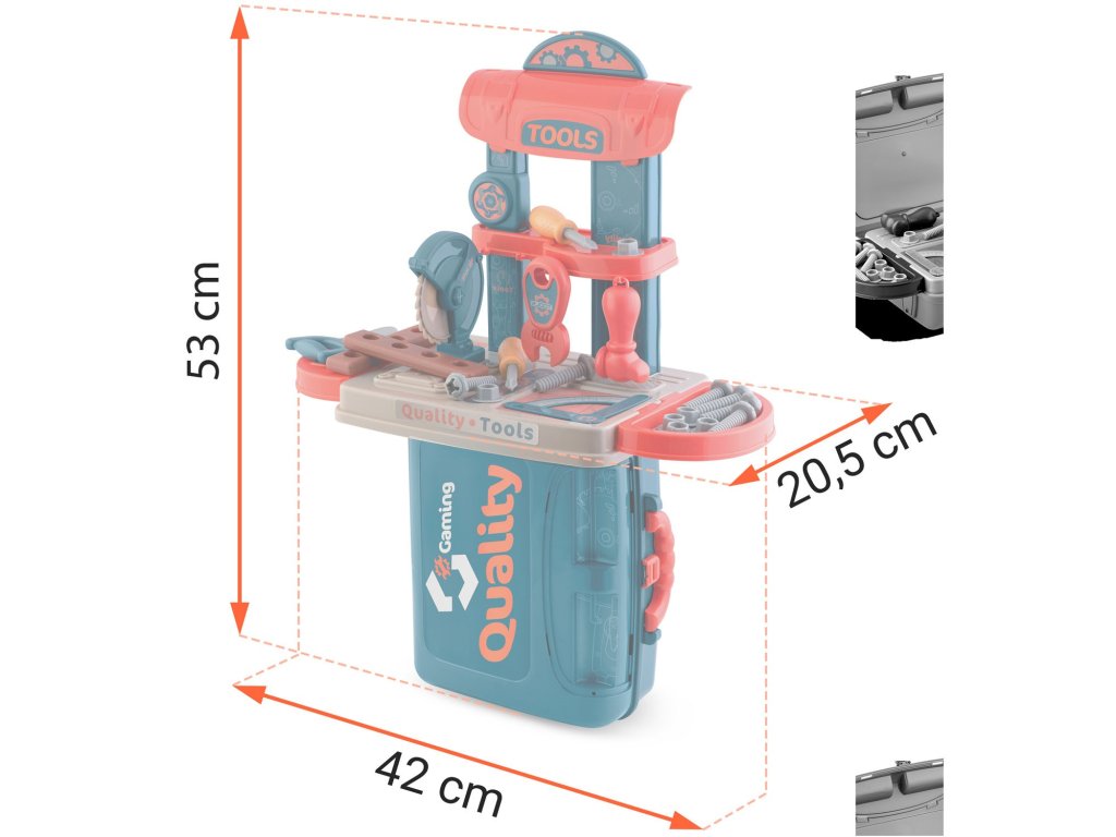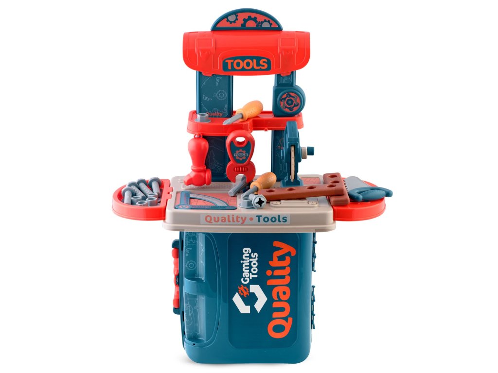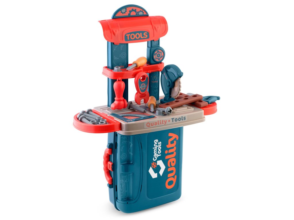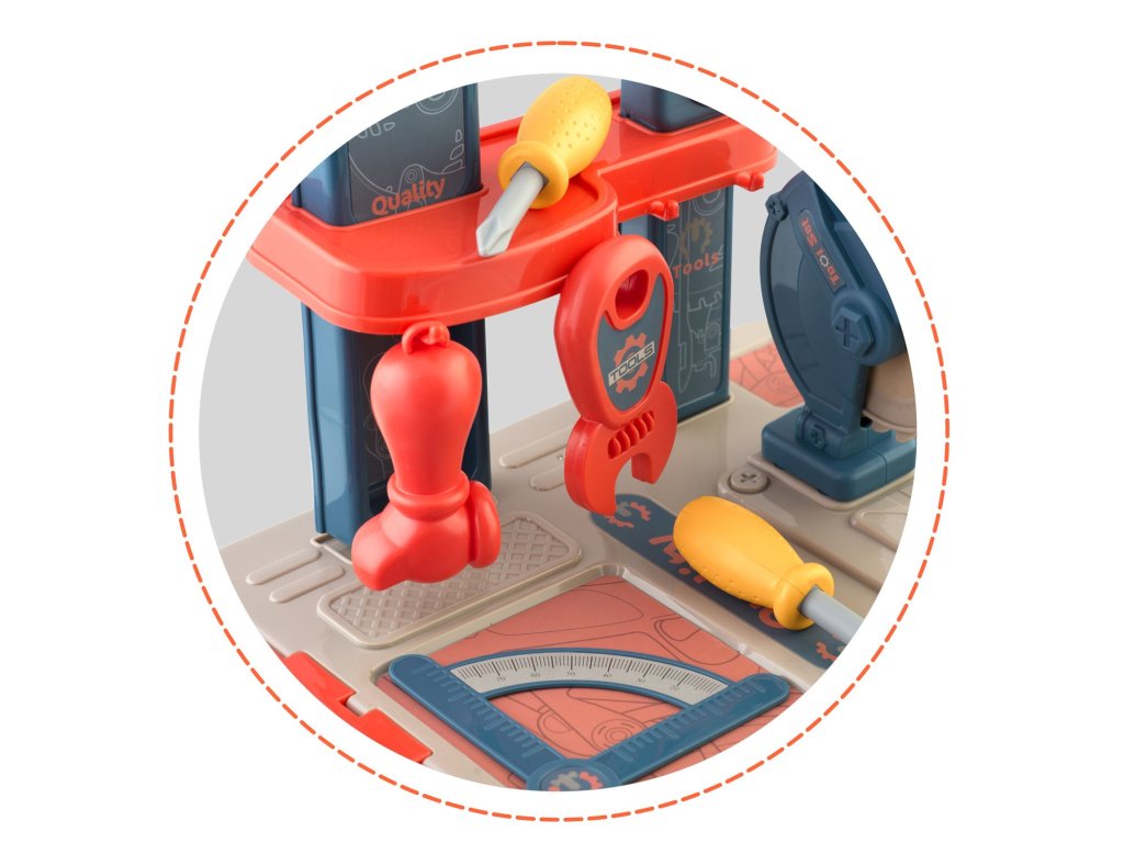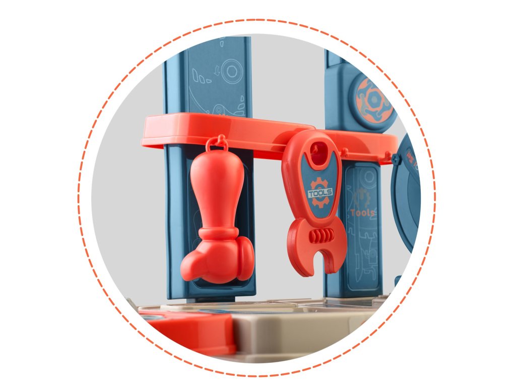 Predstavljamo delovno mizo za otroke opremljeno s policami in setom orodja, ki spominjajo na prava, le da so iz plastike, ki jo je enostavno ohranjati čisto.