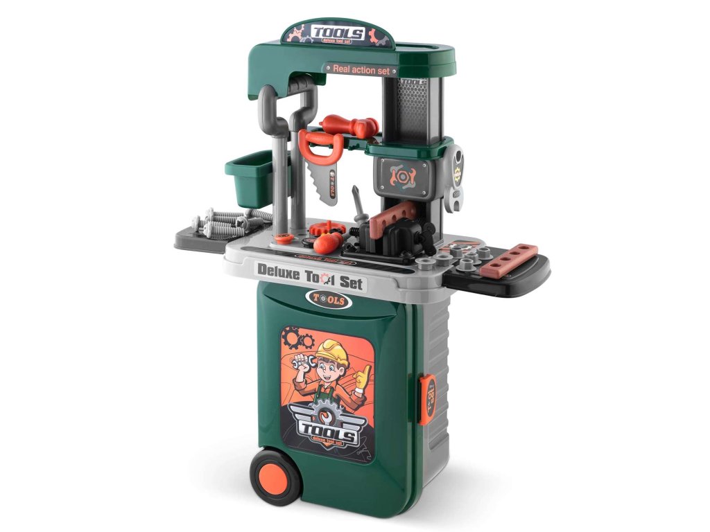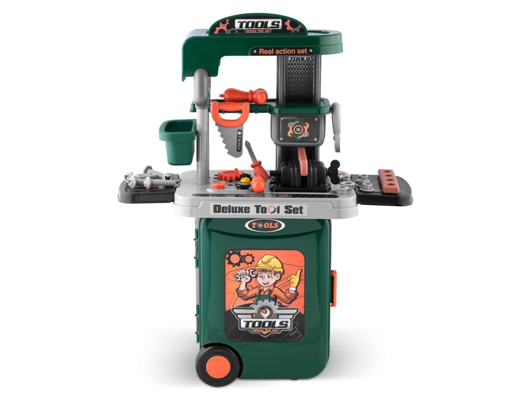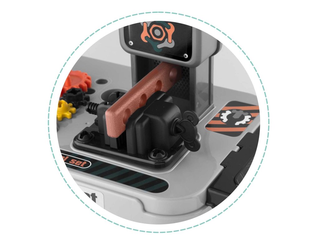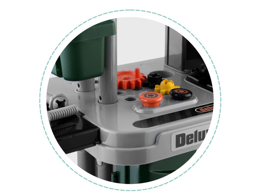 Predstavljamo delovno mizo za otroke opremljeno s policami in kompletom orodij, ki spominjajo na prave, le iz plastike, ki jo je enostavno ohranjati čisto.