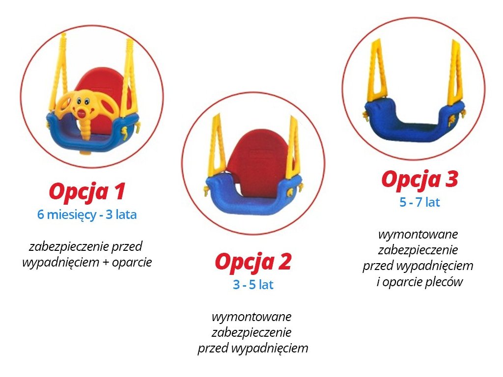 - močne vrvi dolžine do 130 cm, nastavljive s kovinskimi zaponkami, vrvi pa so dodatno zavarovane s posebnimi plastičnimi zaščitami, ki ščitijo otrokove roke pred morebitnimi odrgninami in povečujejo stabilnost pri guganju