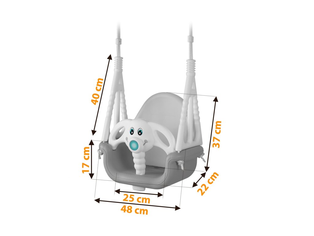 - Močne vrvi z dolžino do 130 cm je mogoče nastaviti s pomočjo kovinskih sponk, vrvi so dodatno zaščitene s posebnimi plastmi, ki ščitijo otroške roke pred morebitnimi odrgninami in povečujejo stabilnost pri guganju.