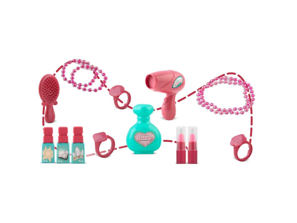 - številni dodatki (sušilec za lase, krtača, prstani 3 kosi, parfum, šminka 2 kosa in lak za nohte 3 kosi, ogrlica 1 kos in zapestnice 2 kosa),