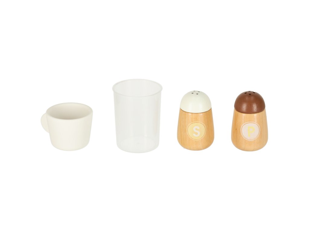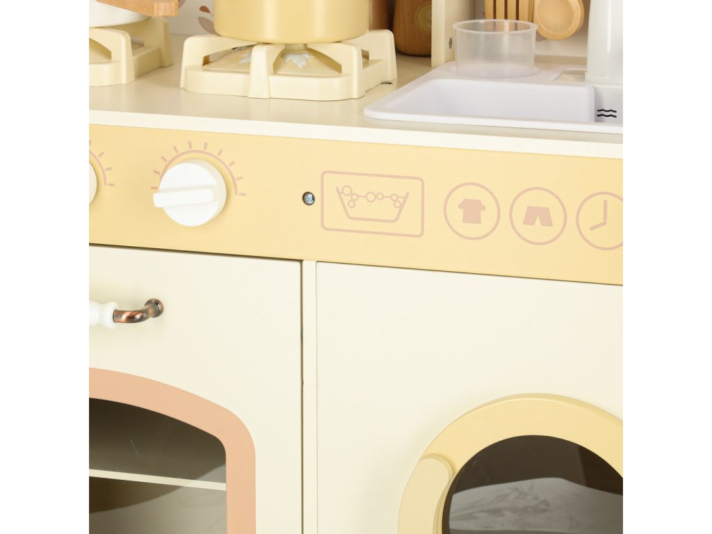 Del lesene otroške kuhinje je oprema, kot soskodelica, lonec, ponev, kuhinjskelopatice, solnica in poper, pa tudipralni stroj, mikrovalovna pečica,pečica, pomivalno korito s funkcijo izliva in shranjevalne omare. Tako bo ustvarjalna igra postala vsakodnevna dejavnost inotrok se bo naučil svobodno gibati in vzdrževati svoj kuhinjski prostor urejen.