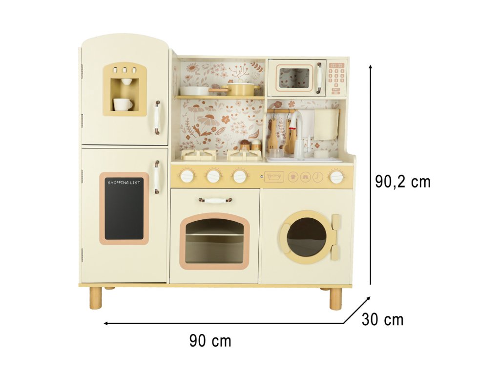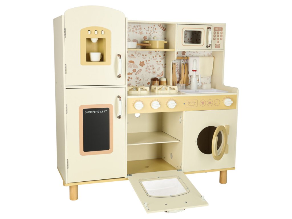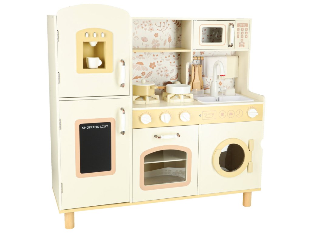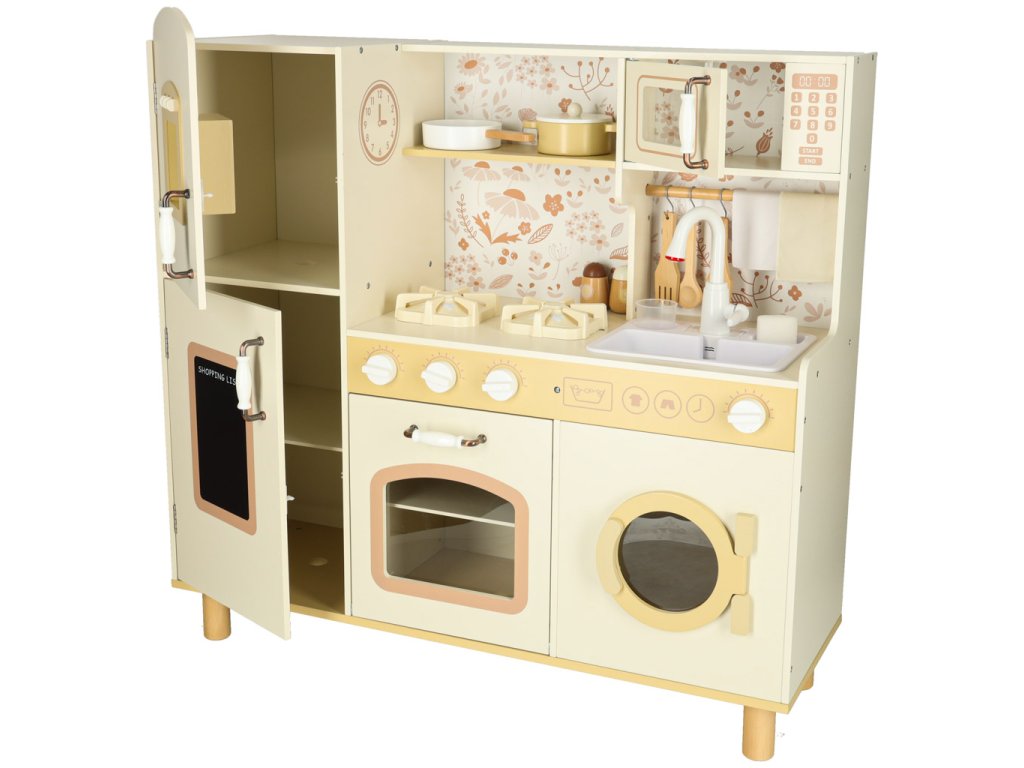 Otroška kuhinja za dečke in deklice, ki se radi igrajo in skupaj igrajo vlog. Kuhinja učisodelovanja, delitve odgovornosti in potrpežljivosti. Lesena otroška kuhinja ponuja priložnost za učenje osnovnih veščin pri pripravi hrane, pospravljanju in načrtovanju.