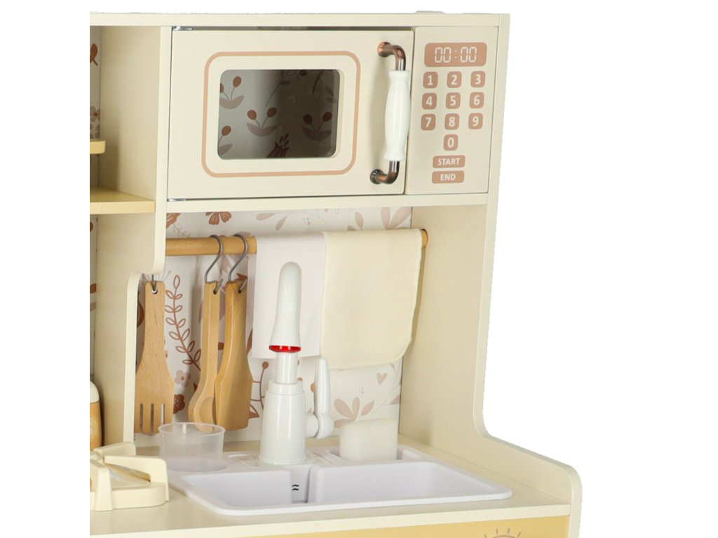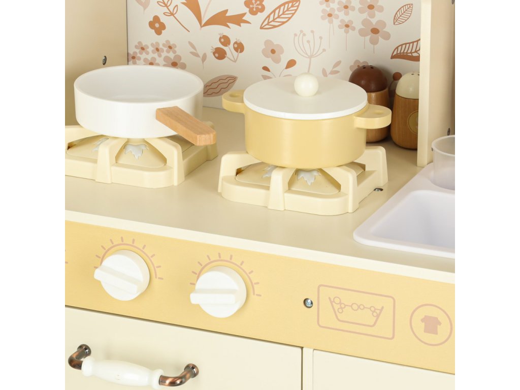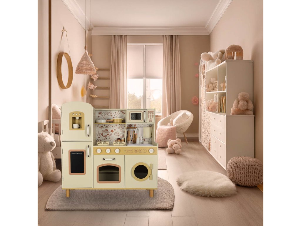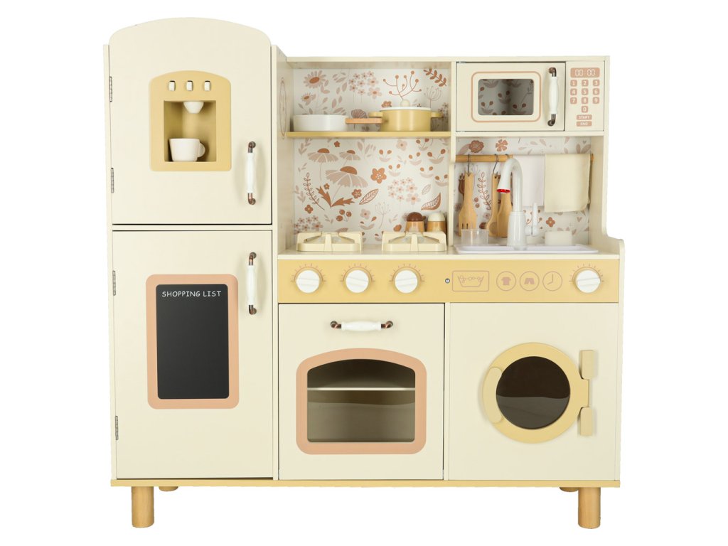Otroška kuhinja za dečke in deklice, ki se radi igrajo in skupaj igrajo vlog. Kuhinja učisodelovanja, delitve odgovornosti in potrpežljivosti. Lesena otroška kuhinja ponuja priložnost za učenje osnovnih veščin pri pripravi hrane, pospravljanju in načrtovanju.