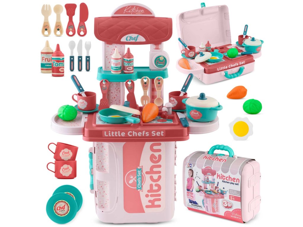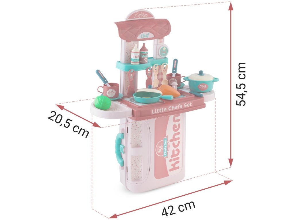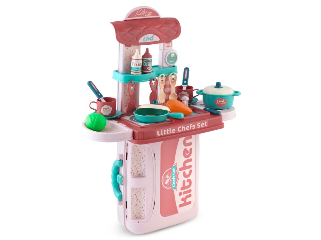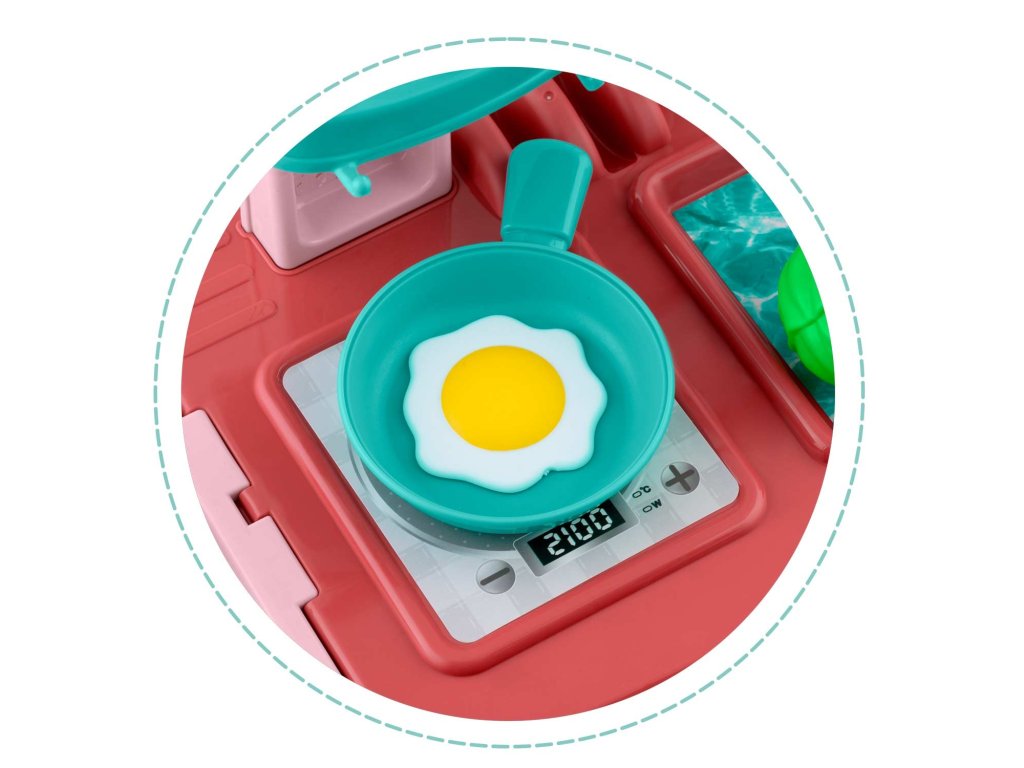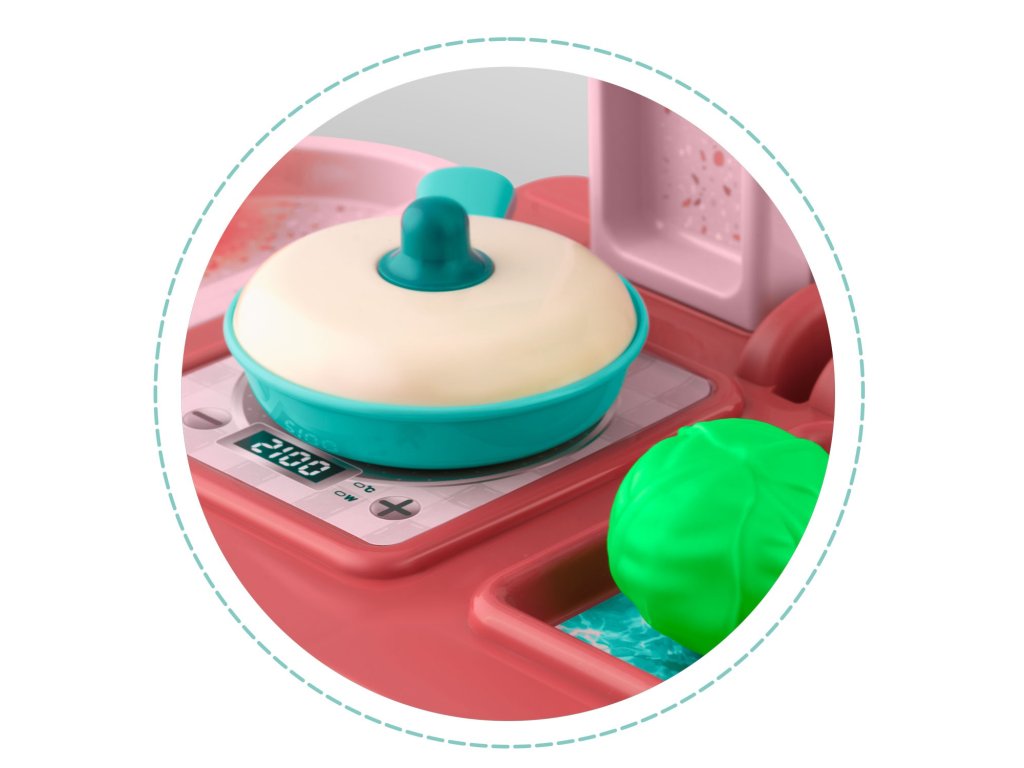 K kuhinji sodi številni dodatki: pribor in kuhalne žlice 7 kosov, skodelice 2 kosa, podloga za kozarec (lahko se uporabi tudi kot krožnik) 2 kosa, jajčka 1 kos, lonec 1 kos, ponev 1 kos, pokrov 2 kosa, sadna omaka 1 kos, kečap 1 kos, zelenjava 2 kosa (glavnata solata + korenje).