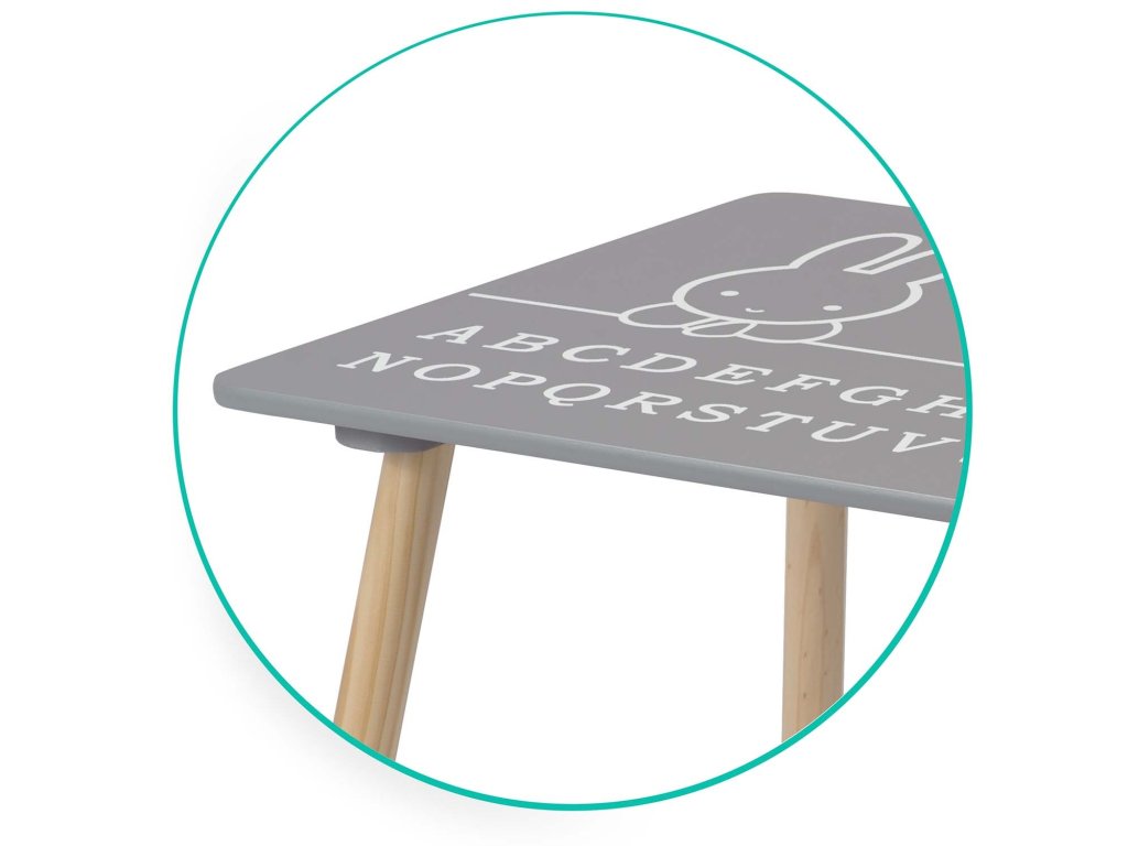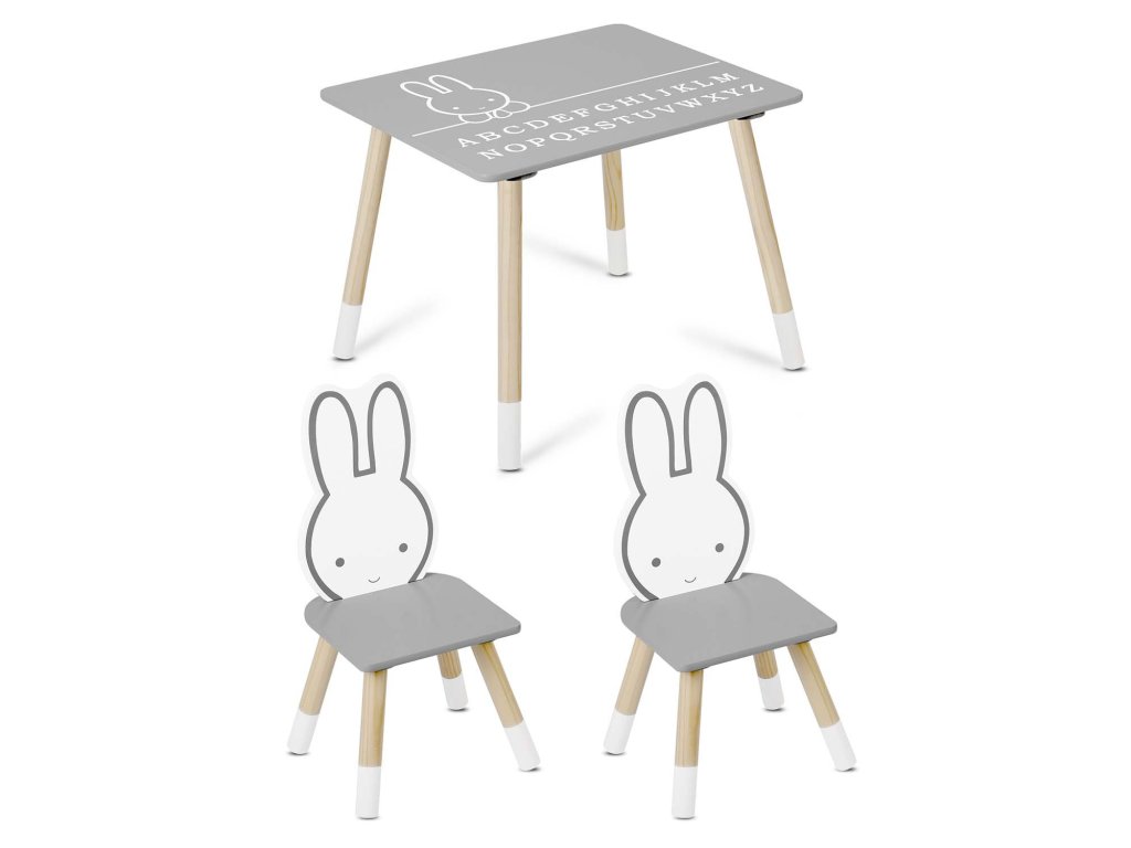 Na mizi je abeceda, ki spodbuja učenje črk in stoli imajo obliko nasmejanih zajčkov, ki bodo zagotovo pritegnili vašega malčka!