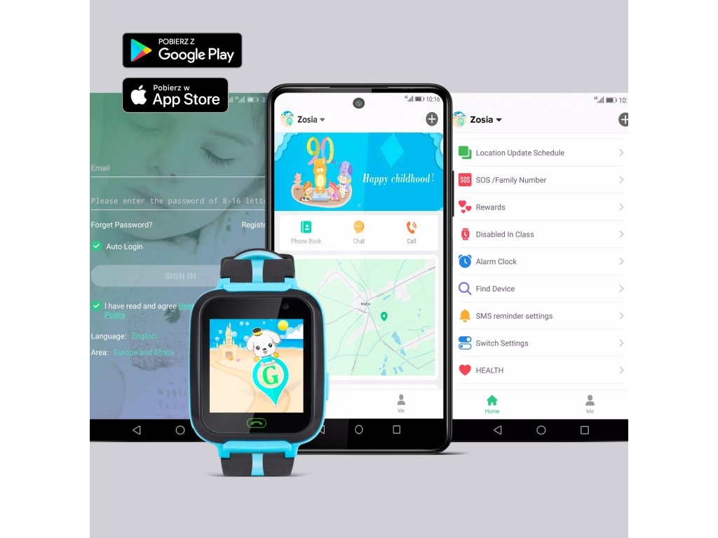 Funkcije aplikacij: GPS sledenje, določitev varnostne cone, nadzor aktivnosti, upravljanje funkcij ure