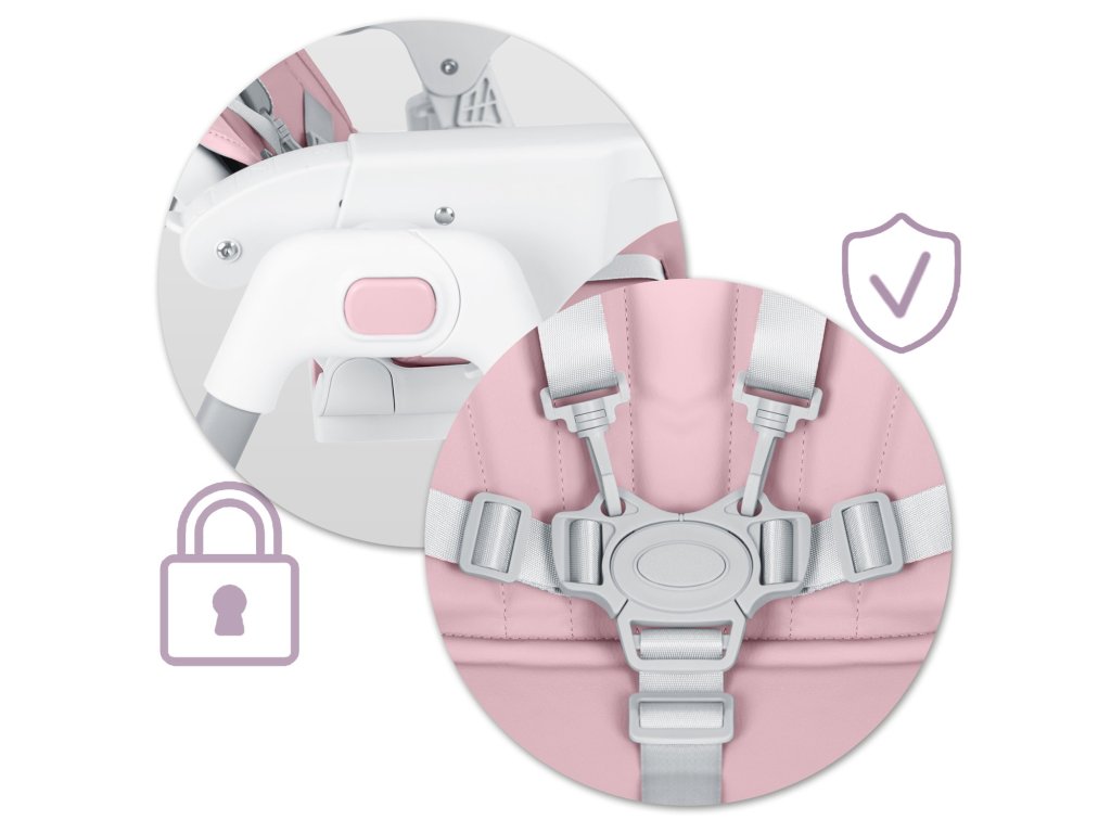 Zanesljivi in preverjeni pettočkovni varnostni pasovi pomenijo, da otrok ne bo mogel sam zapustiti stola in tvegati padca.