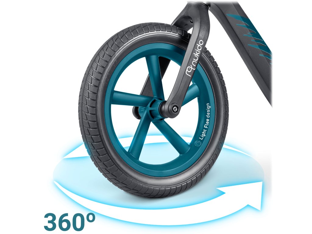 - Lažje zavijanje: vrtljiva kolesa 360 stopinj omogočajo otroku hitro in natančno zavijanje v katerokoli smer, brez potrebe po dvigovanju sprednjega kolesa ali izvajanju večjih telesnih premikov.