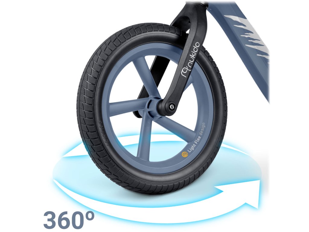 - Lažje zavijanje: vrtljiva kolesa 360 stopinj omogočajo otroku hitro in natančno zavijanje v katerokoli smer, brez dvigovanja prednjega kolesa ali večjih premikov telesa.