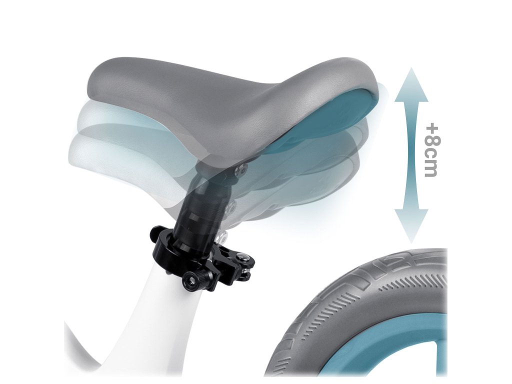 - Daljša doba uporabe: možnost nastavitve višine sedeža do 8 cm omogoča prilagoditev poganjalca spremembam rasti otroka, kar pomeni, da je lahko uporabljen dlje časa.