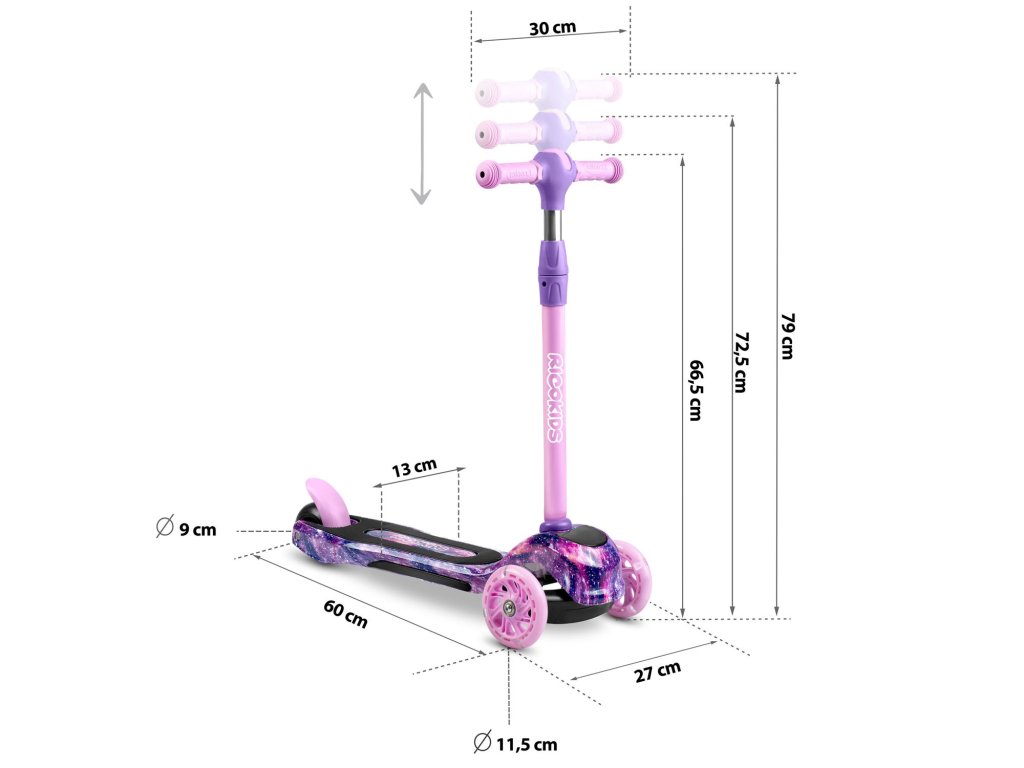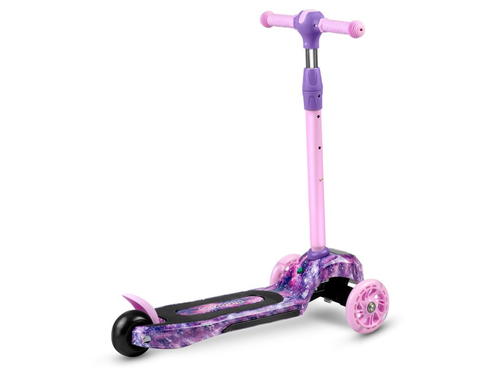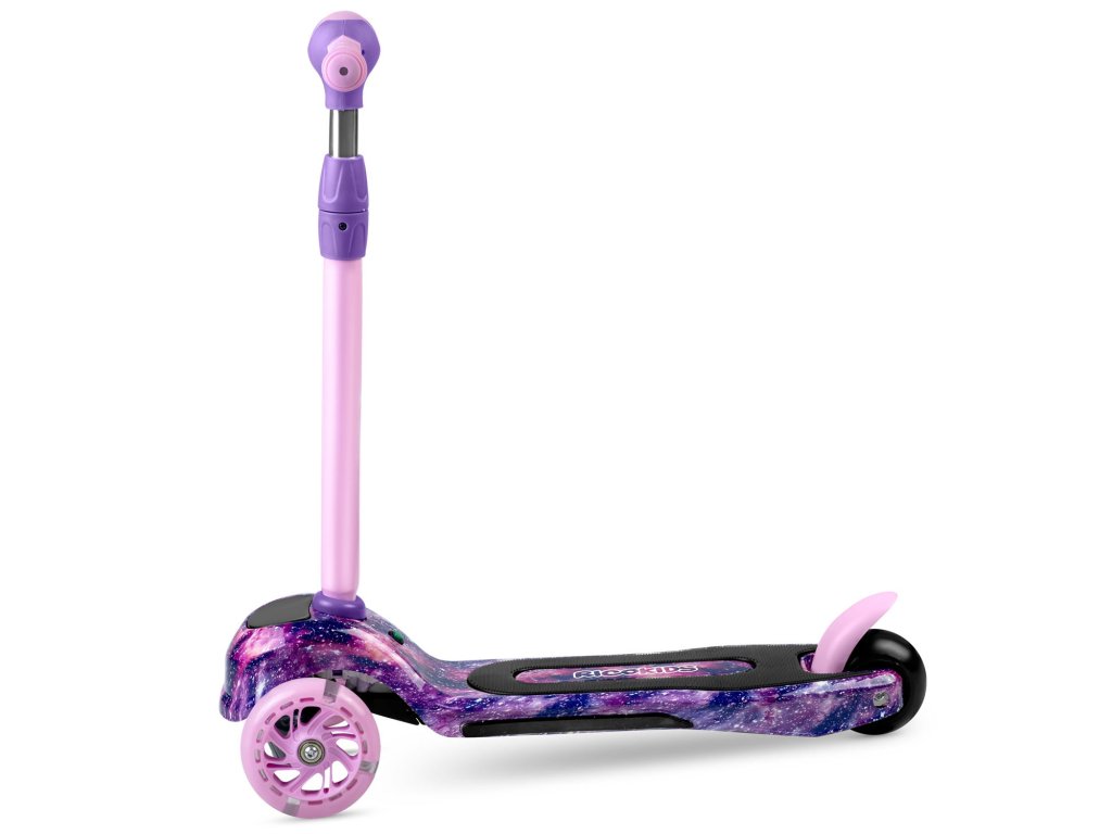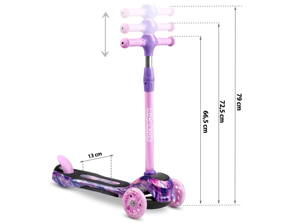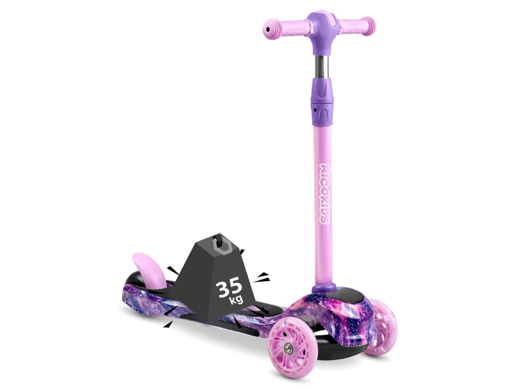 Ta skiro vam omogoča upravljanje z ravnotežjem telesa brez vrtenja krmila. Dovolj je nagibanje v želeno smer – in to je to. Otrok lahko hitro usvoji to tehniko vožnje in hkrati vadi občutek za ravnotežje. Je tudi varnejša oprema za manjše otroke – sam skiro je zaradi treh koles stabilen v navpičnem položaju.