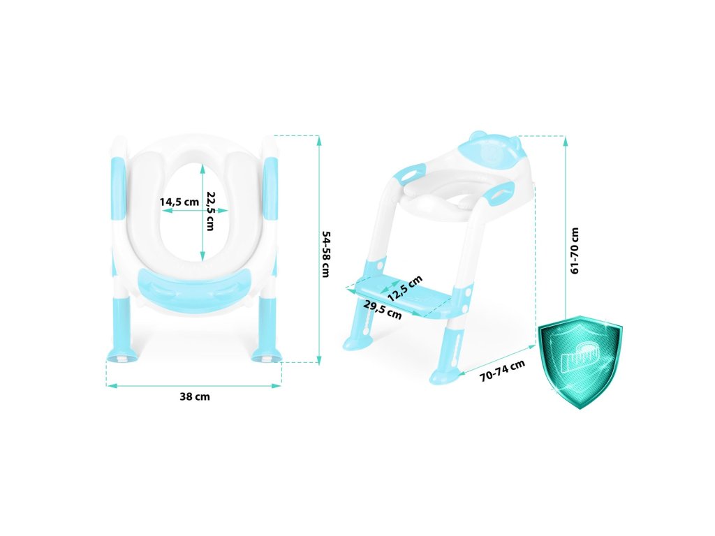 Zaradi ergonomske zasnove je nastavek za stranišče udoben in prilagojen obliki otroške hrbtenice, njegova višina pa je nastavljiva, tako da se prilega praktično vsem modelom stranišč.