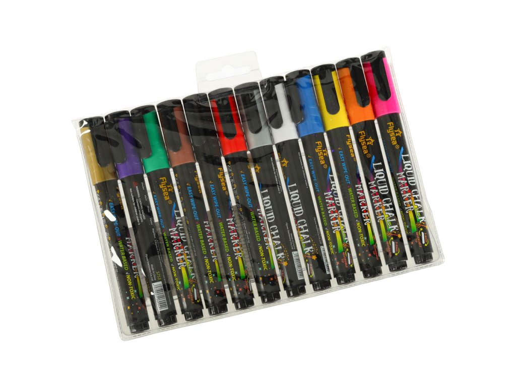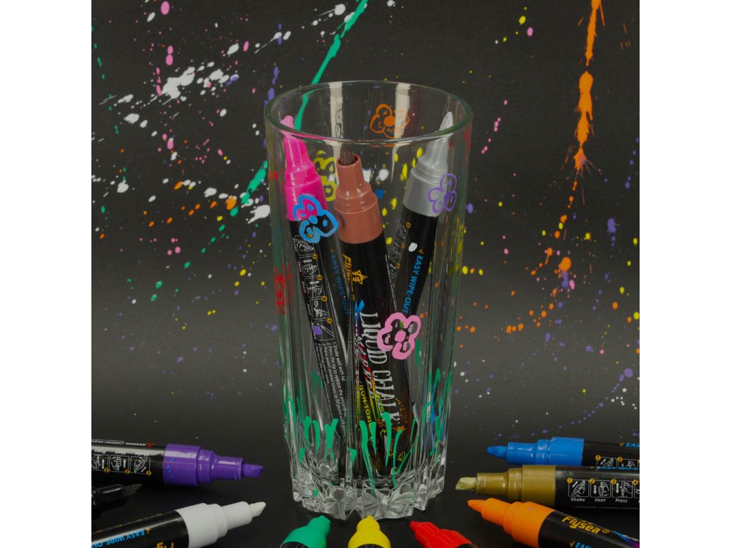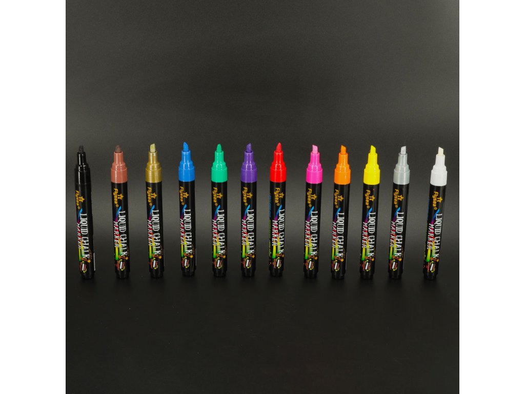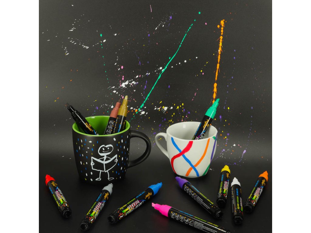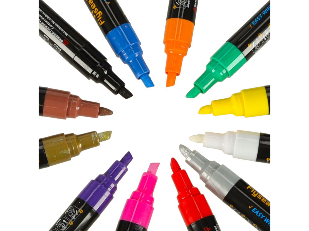 Ta komplet vsebuje 12 barv, ki so idealne za ustvarjanje izrazitih napisov, ilustracij in dekoracij. Idealni so za dekoriranje izložb, ogledal, brisalnih tabel, keramičnih skodelic in drugih gladkih površin.