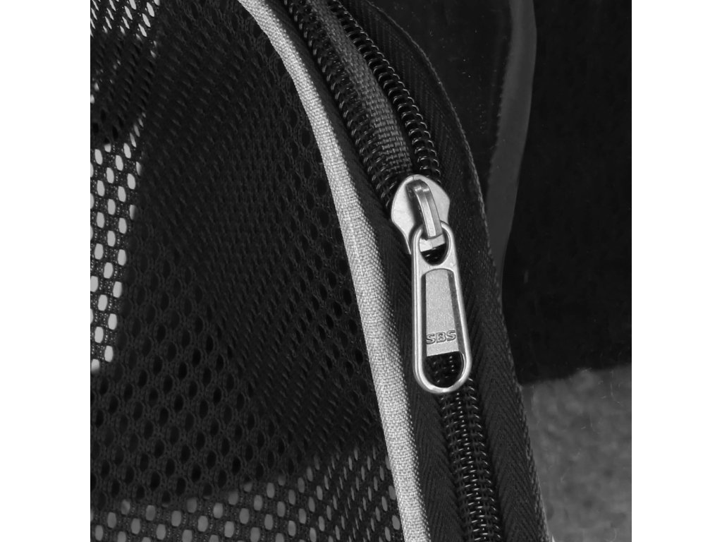 - Sprednja pokrivka zaprta z enosmerno zadrgo, zgornja pokrivka in dno imata dvostranske zadrge.