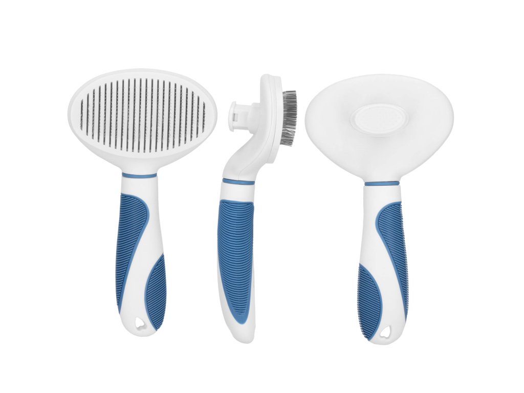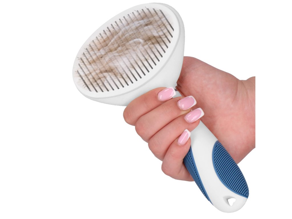 - Pritisnite gumb na zadnji strani, s čimer se konice skrijejo, kar omogoča hitro in enostavno odstranjevanje zbranih dlak s krtače.