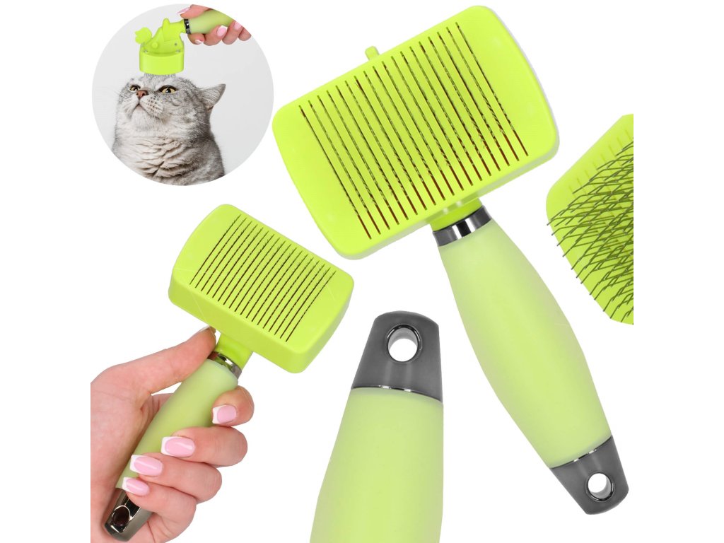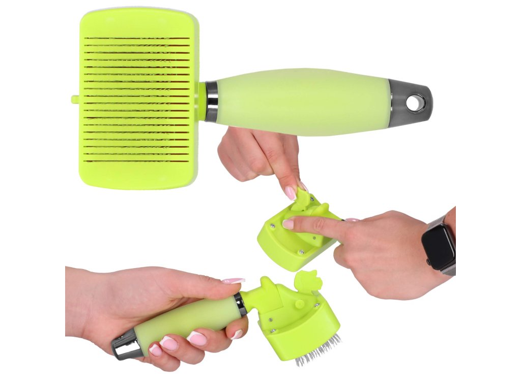 - Na česalnem delu se nahajajo premične igle Silikonski del ročaja je prožen, prilagaja se roki, zelo mehak na dotik Pritisk na gumb in premikanje ročice naprej v obliki psa povzroči, da se igle izpostavijo Pritisk na gumb in premikanje ročice nazaj v obliki psa povzroči, da se igle umaknejo Izpostavljene igle so negibljive Na koncu kovinskega dela praktična zanka za obešanje