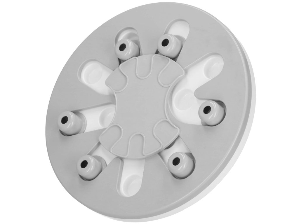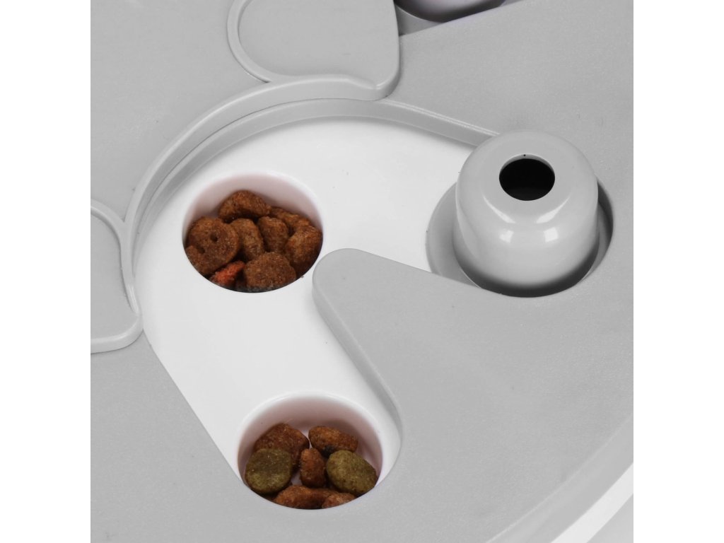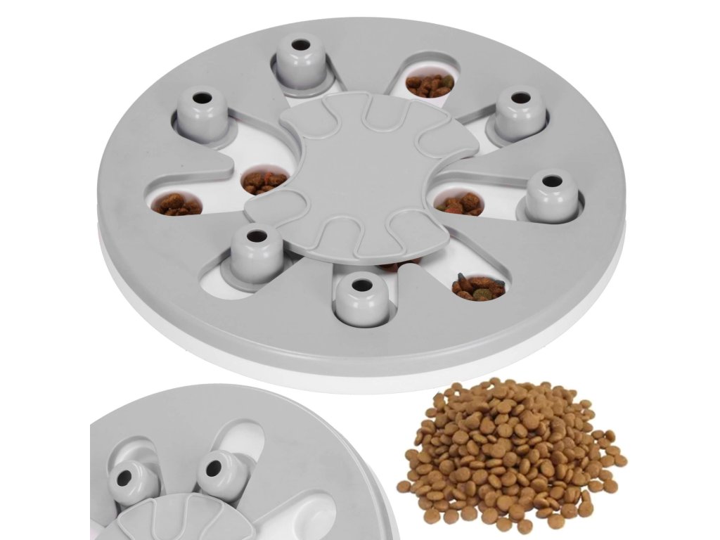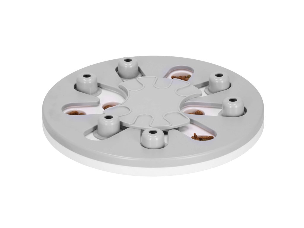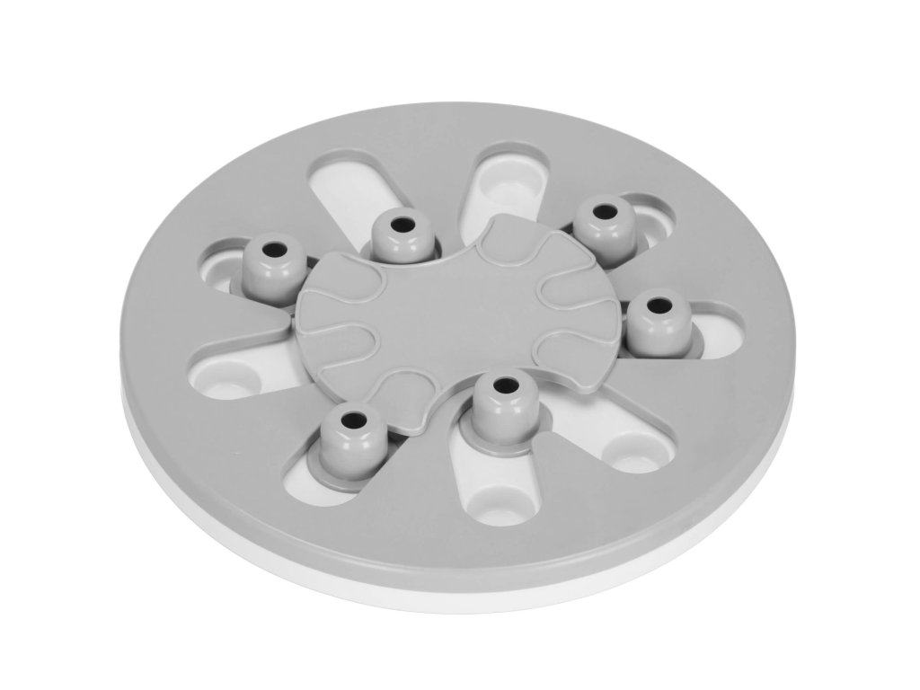 - Igrača ima premične elemente, ki jih lahko pes premika - srednji element se vrti in izstopajoči elementi se premikajo vzdolž posebnih poti. V njih so vdolbine, kamor lahko na primer postavite priboljške, ki jih je mogoče prekriti s premičnimi elementi, in naloga psa/mačke je, da jih najde.