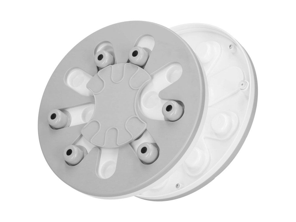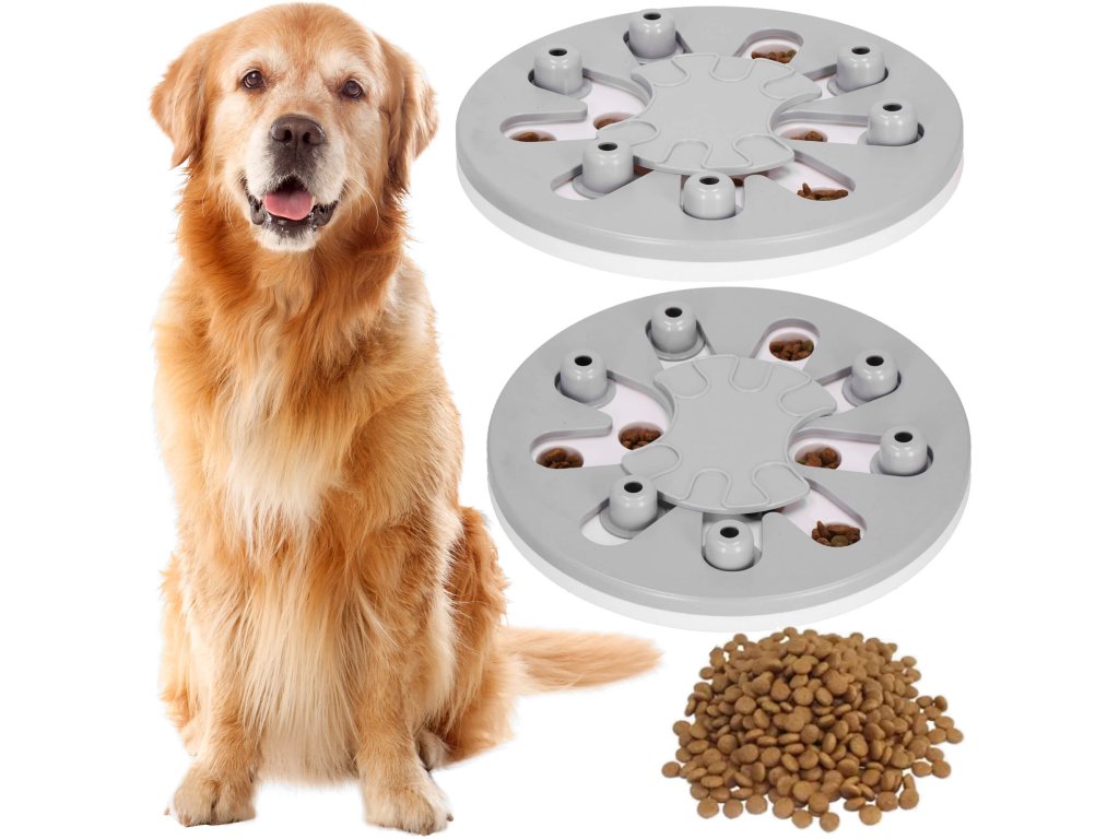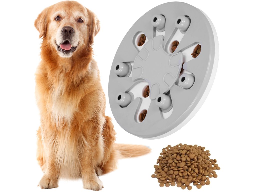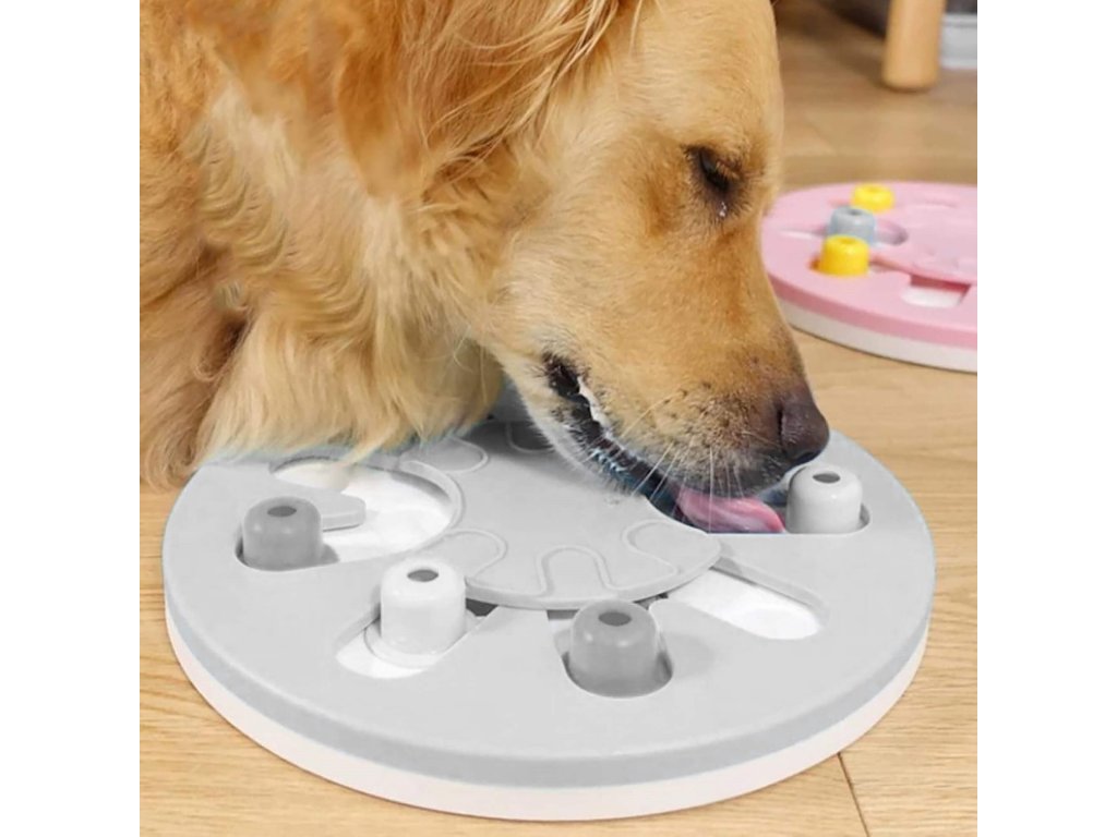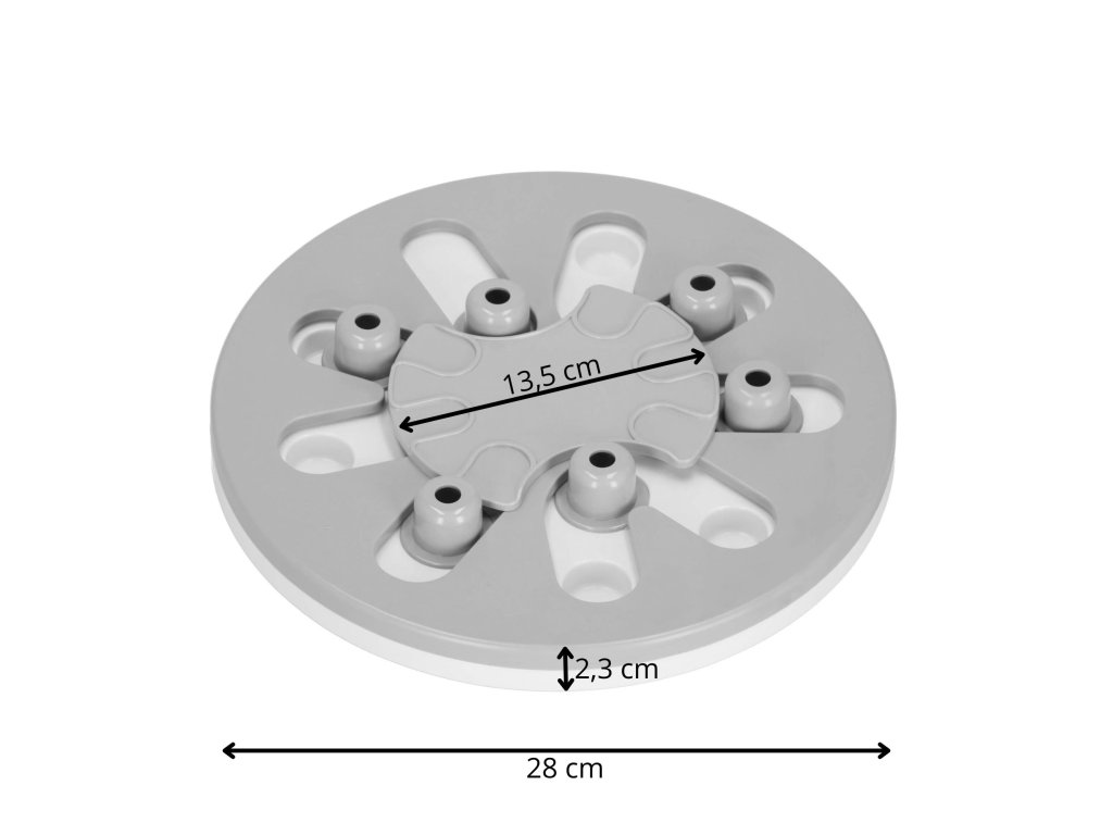 - Igrača ima premične elemente, ki jih lahko pes premika - srednji element se vrti in izstopajoči elementi se premikajo vzdolž posebnih poti. V njih so vdolbine, kamor lahko na primer postavite priboljške, ki jih je mogoče prekriti s premičnimi elementi, in naloga psa/mačke je, da jih najde.