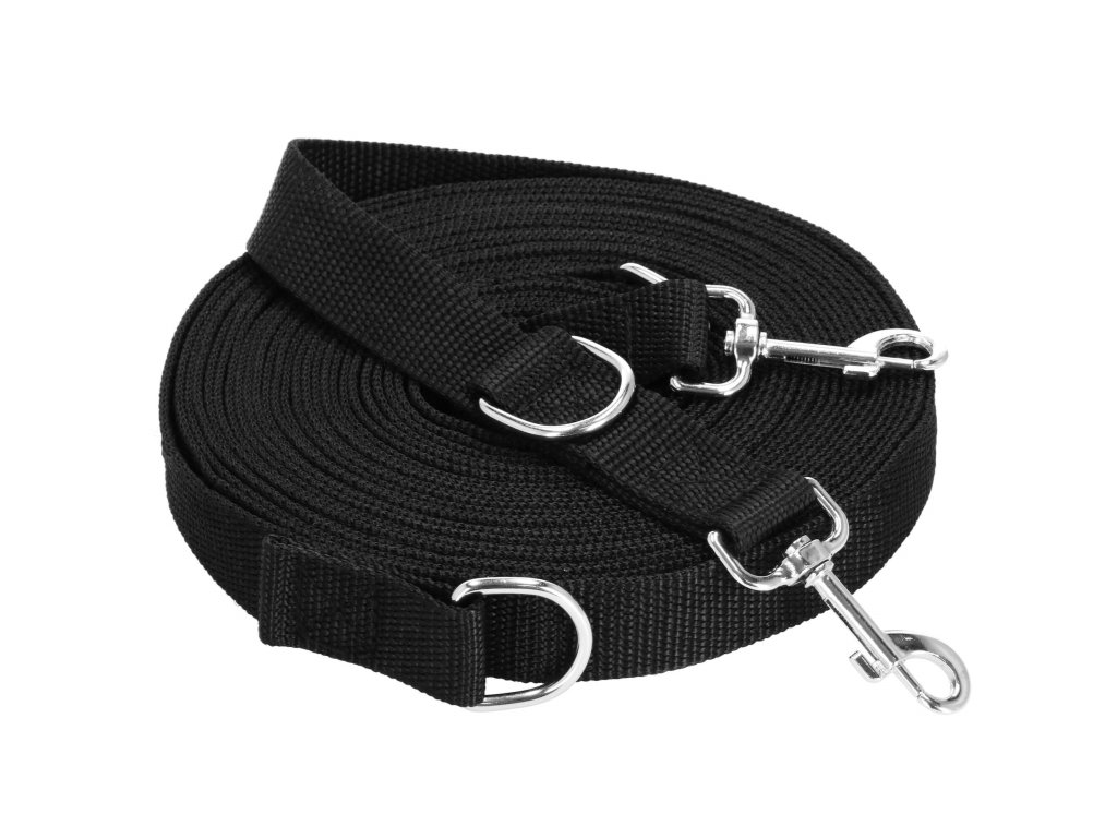 - 2 kovinska D-obroča - pritrditev karabina na D-obroč ustvarja ročaj - zanko z dolžino 30 cm, drugi D-obroč nameščen za karabinom - možnost priklopiti npr. drugi povodec