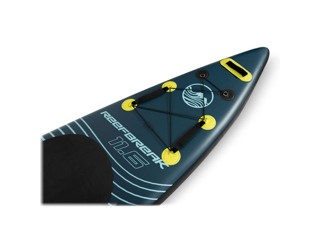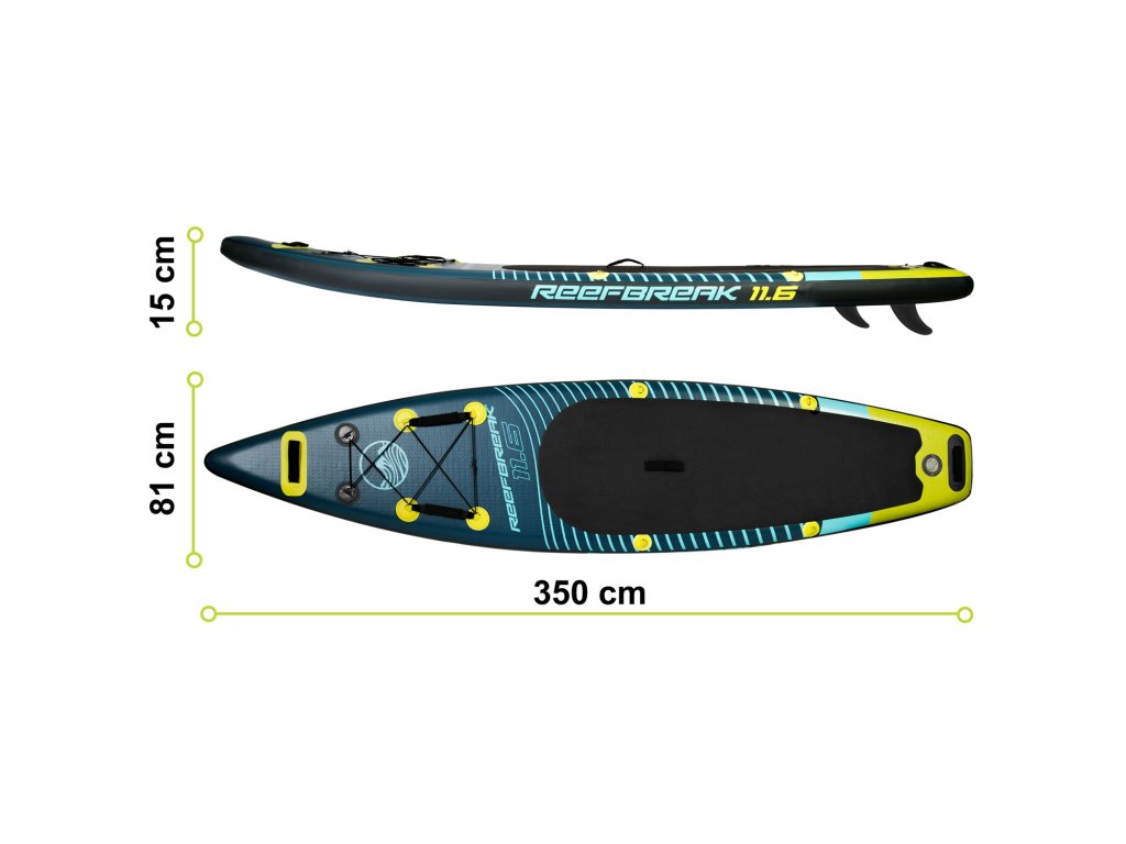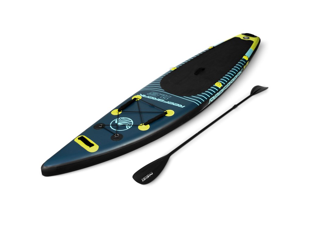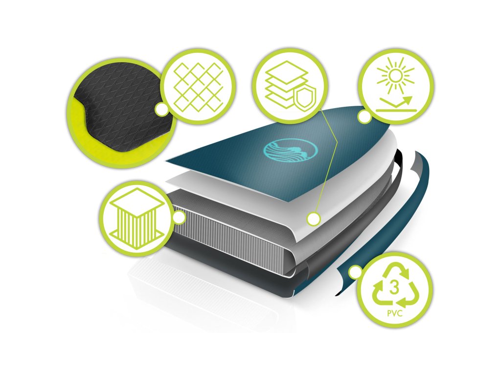 Premium SUP deska s troplastno PVC konstrukcijo, vgrajeno karbon-vlakensko tirnico in ojačanimi šivi.