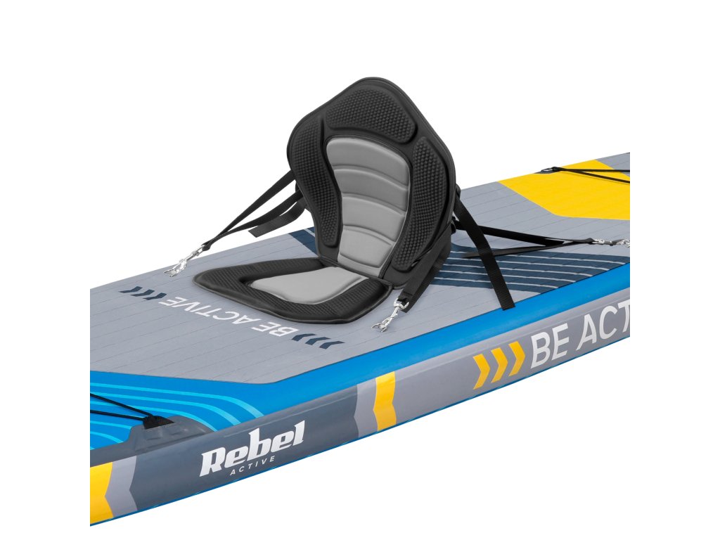 Za še večje udobje in stabilnost med plovbo komplet z SUP desko Rebel Active vključuje udoben sedež z naslonjalom, ki ga lahko enostavno pritrdite ali odstranite glede na svoje želje. Ta rešitev omogoča udobno sprostitev med daljšimi izleti na vodi. Usedite se, sprostite in uživajte v razgledu in miru narave.