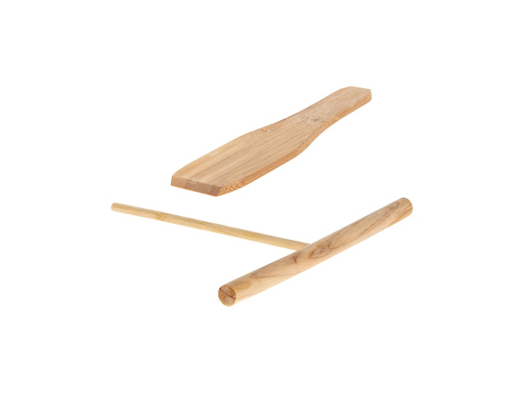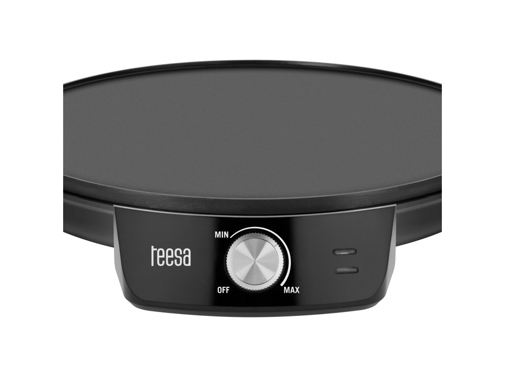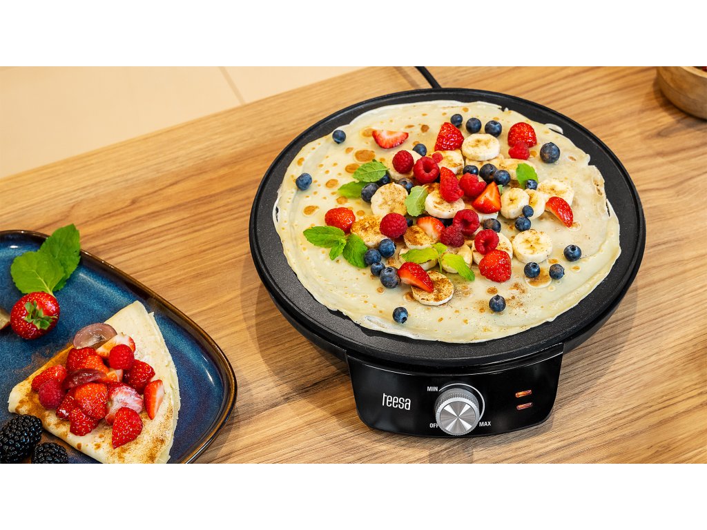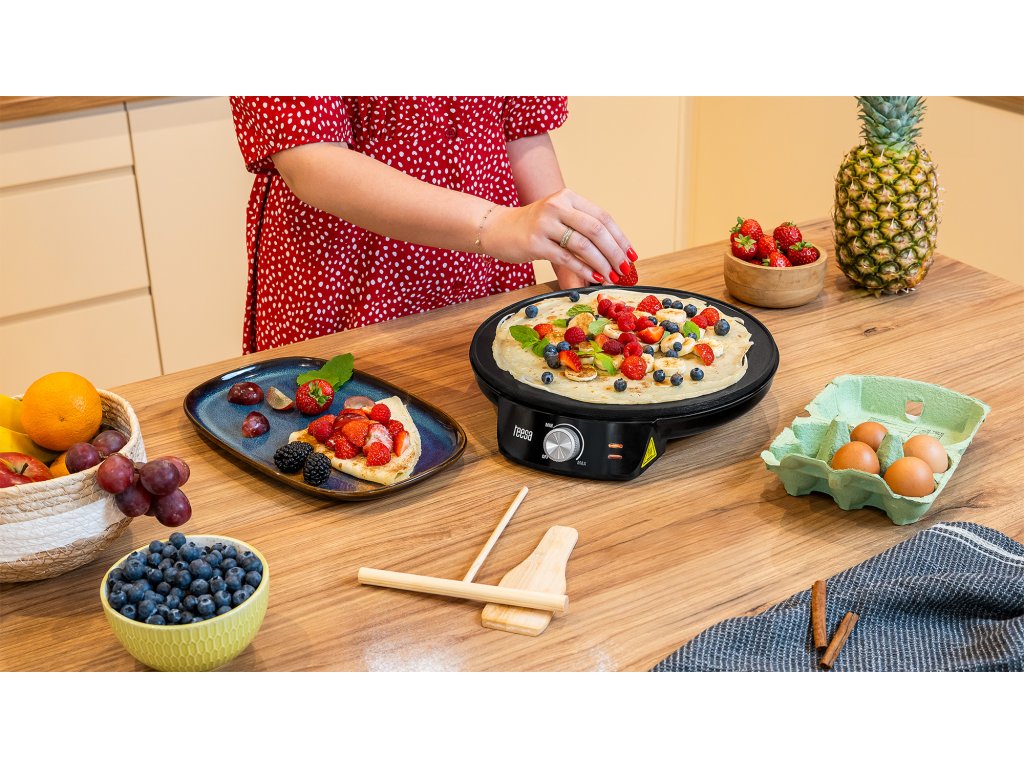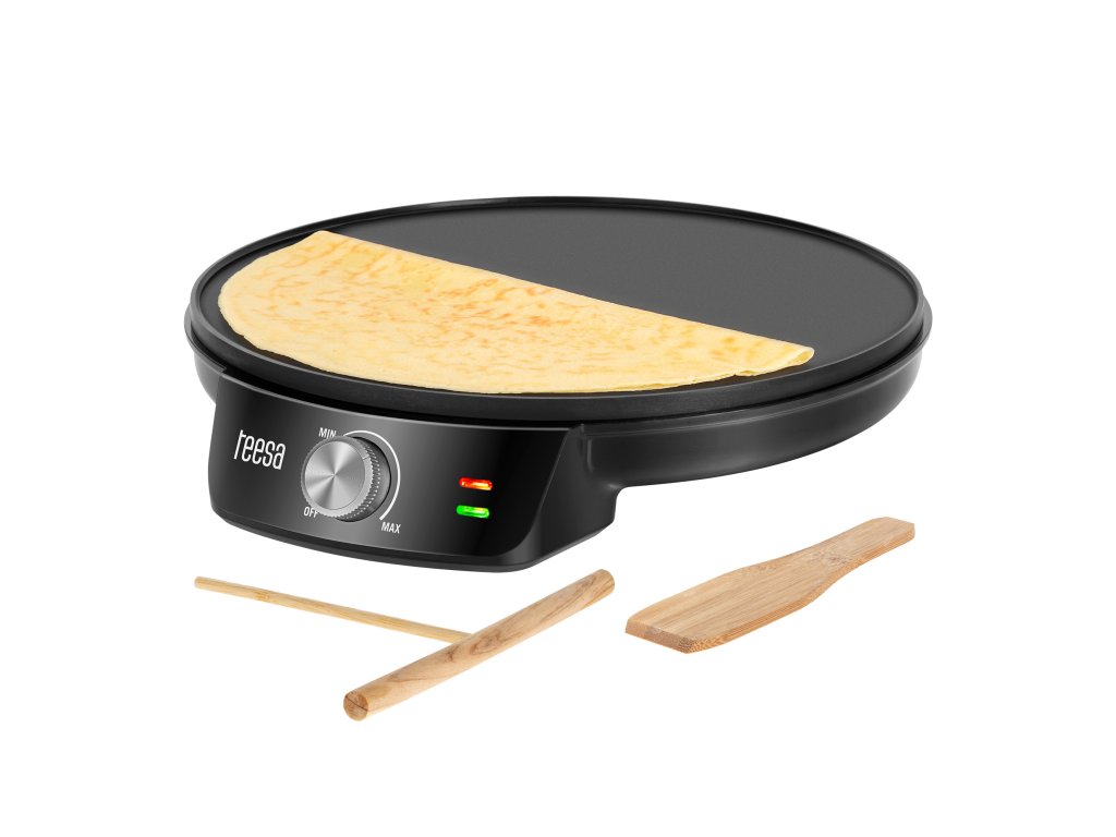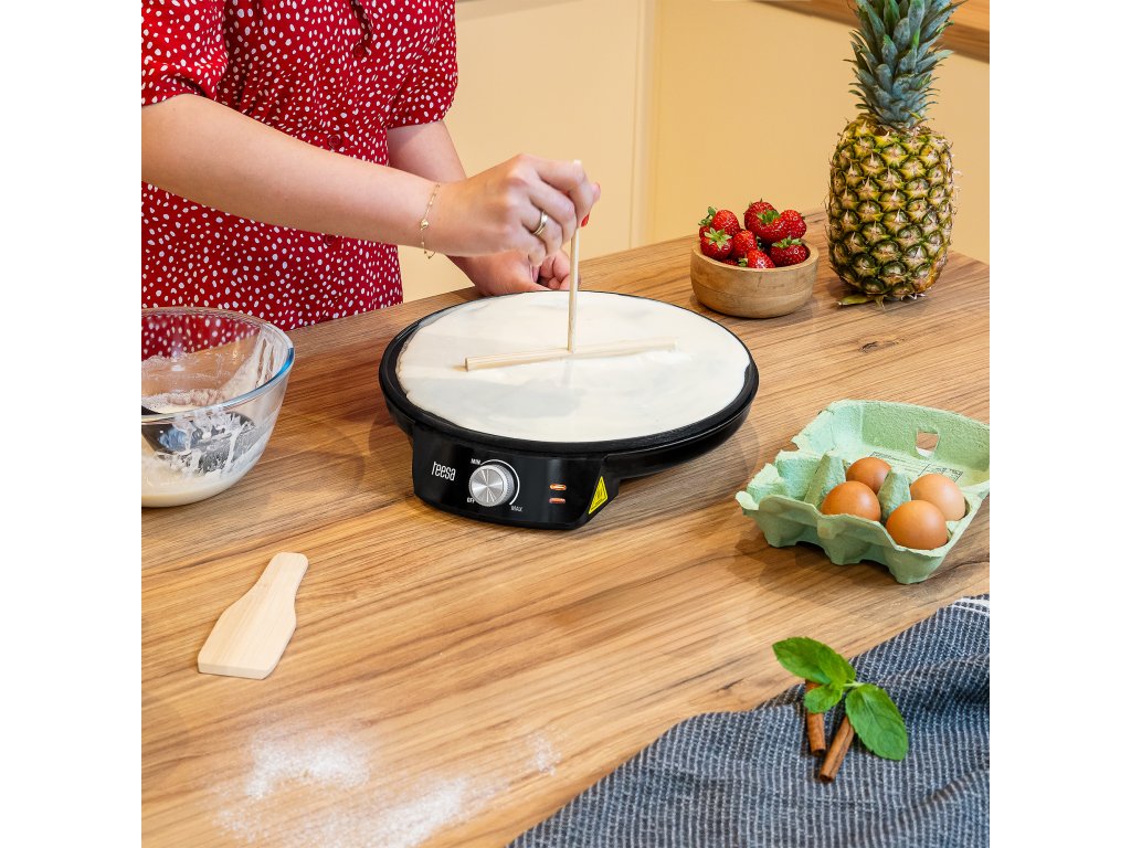 Aparat za palačinke Teesa vključuje tudi dodatke, potrebne za popolno pripravo palačink. V kompletu najdete npr. pripomoček za enakomerno razporeditev testa, da palačinke pridobijo popolno obliko in debelino, ter lopatico, ki olajša obračanje in premetavanje palačink med cvrtjem.
