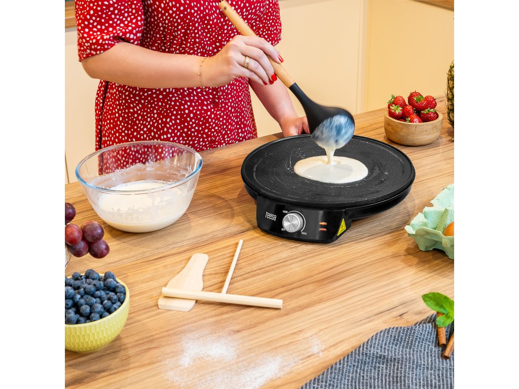 Posebna grelna površina s premerom 30 cm zagotavlja, da vam ni treba skrbeti za lepljivo testo. Palačinke se bodo vedno popolnoma ločile od površine plošče in bodo enakomerno pečene, kar zagotavlja njihovo enostavno pripravo.