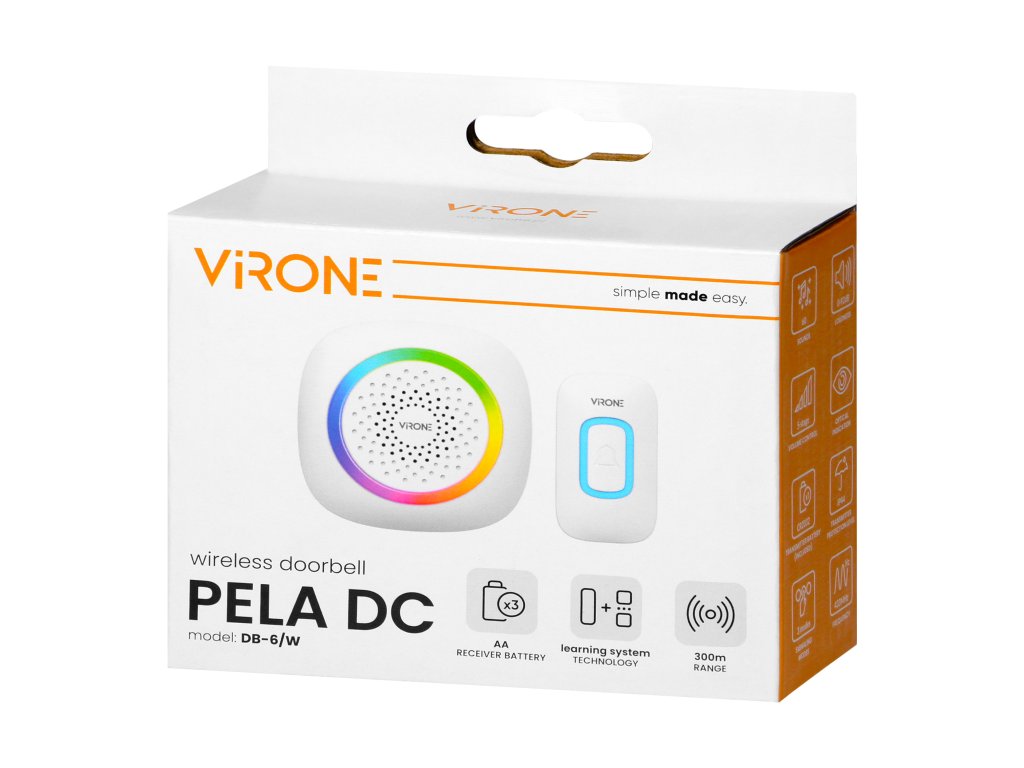 PELA DC, brezžični zvonec na baterije, sistem za učenje, 60 zvokov, LED RGB, 300m, bela