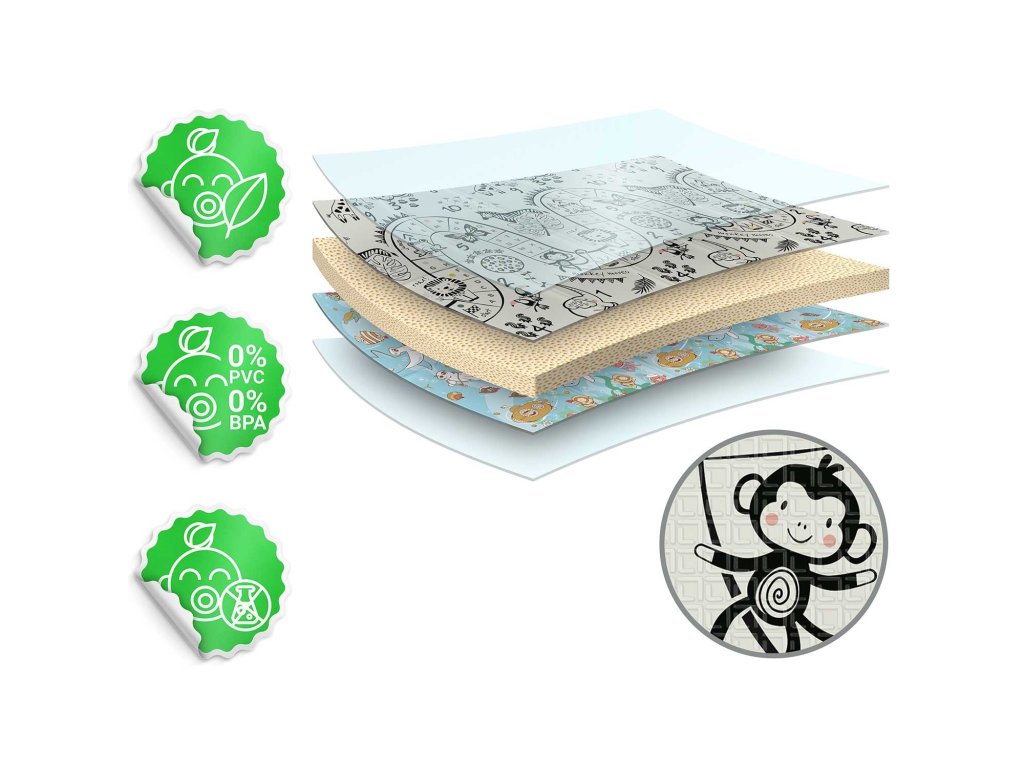 Izdelano iz visokokakovostne XPE pene brez vonja, varno za vašega otroka. Zelo debela pena (1 cm!) blaži padec na trdo tla.
