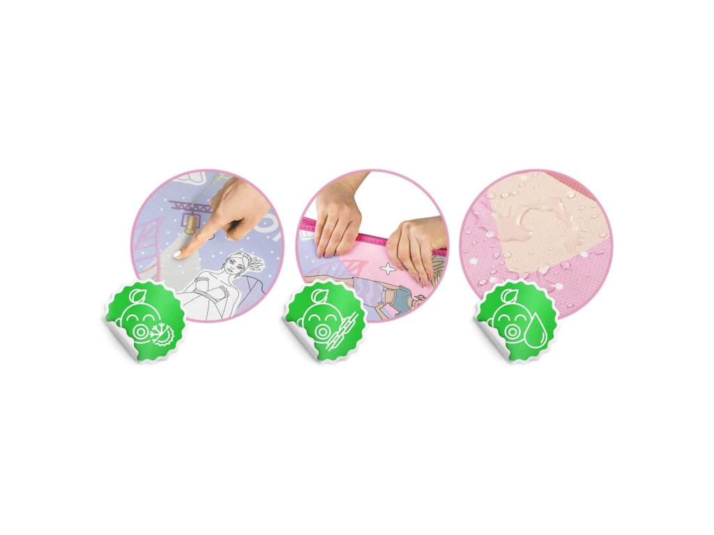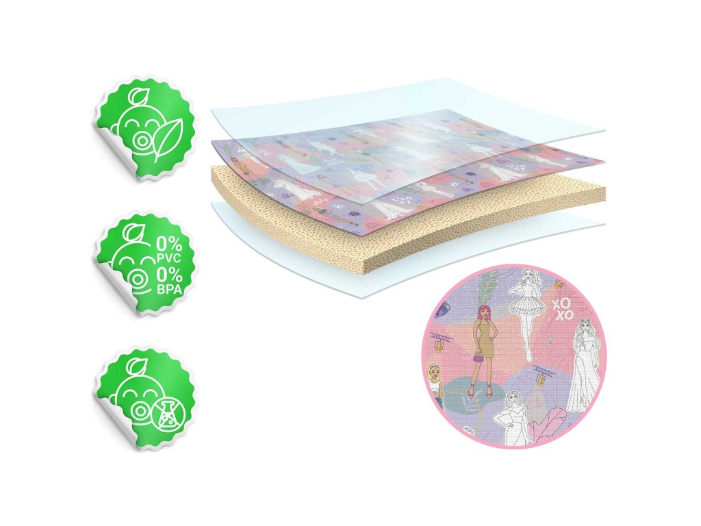 Podloga je izdelana s posebno tehnologijo: risbe z flomastri na njeni površini se hitro sušijo. Vaš otrok bo tako ostal čist in srečen.