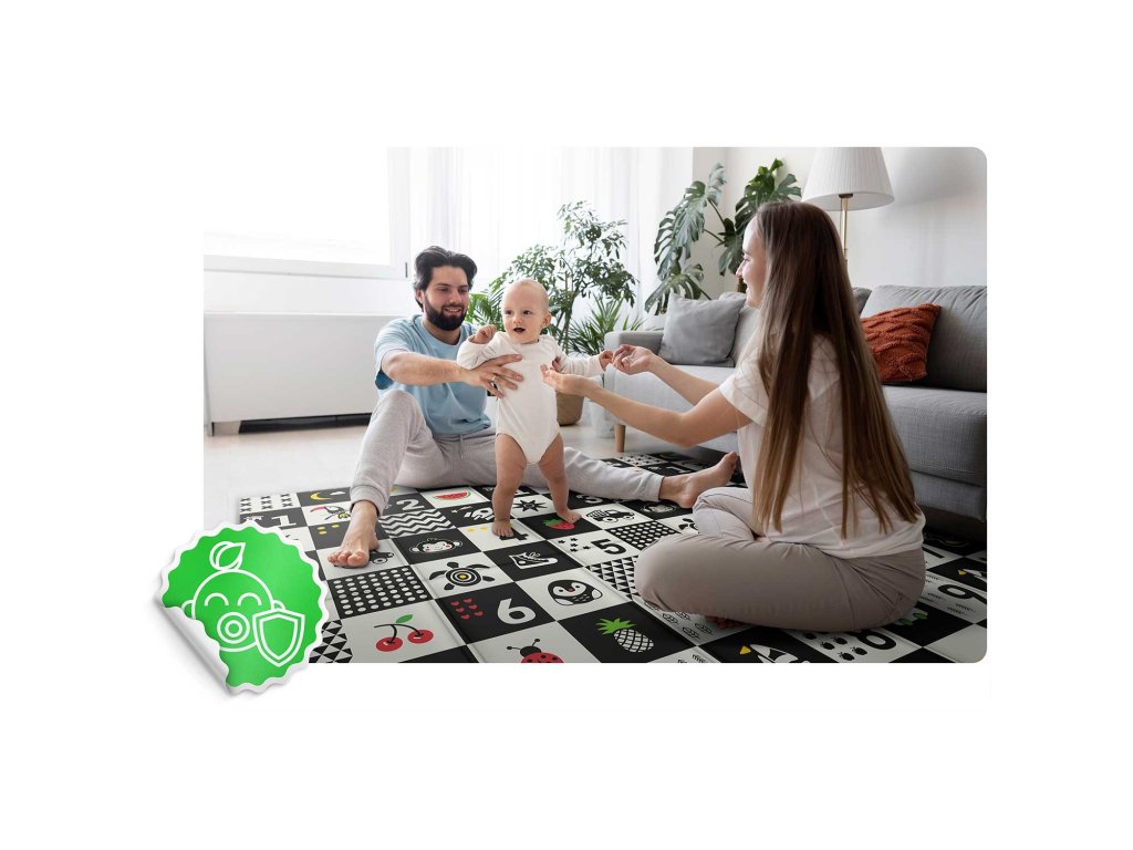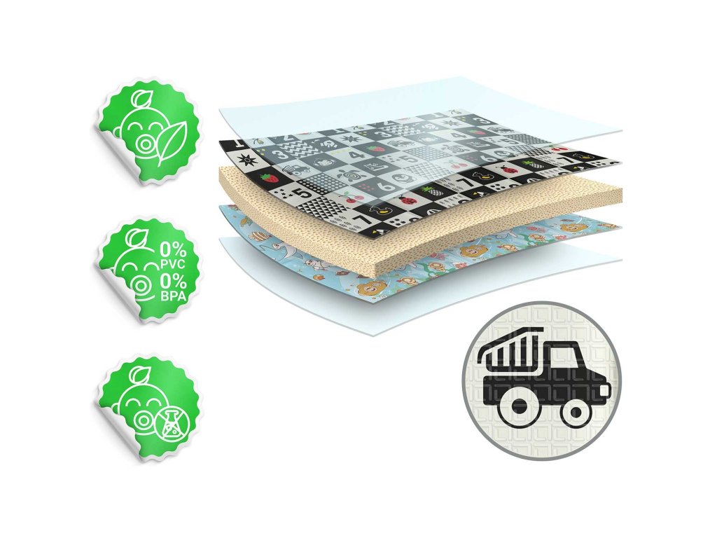 Izdelano iz visokokakovostne XPE pene brez vonja, varno za vašega otroka. Zelo debela pena (1 cm!) ublaži padec na trda tla.