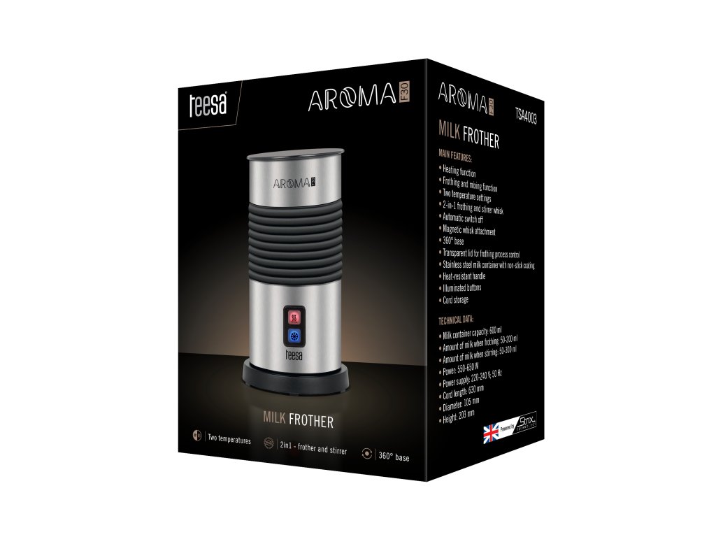 Nič ne polepša jutra kot okusna kava z nežno peno. Še posebej, če njena priprava traja le nekaj trenutkov. Penilnik za mleko Teesa AROMA F30 ti v trenutku omogoči ustvarjanje popolne mlečne pene, ki bo tvoji kavi dodala kanček magije. Poleg tega ti možnost nastavitve hladne ali tople temperature omogoča, da se glede na razpoloženje prepustiš užitku ustvarjanja kapučina ali hladnega frappeja, pa tudi okusnega kakava ali čokolade za najbližje.