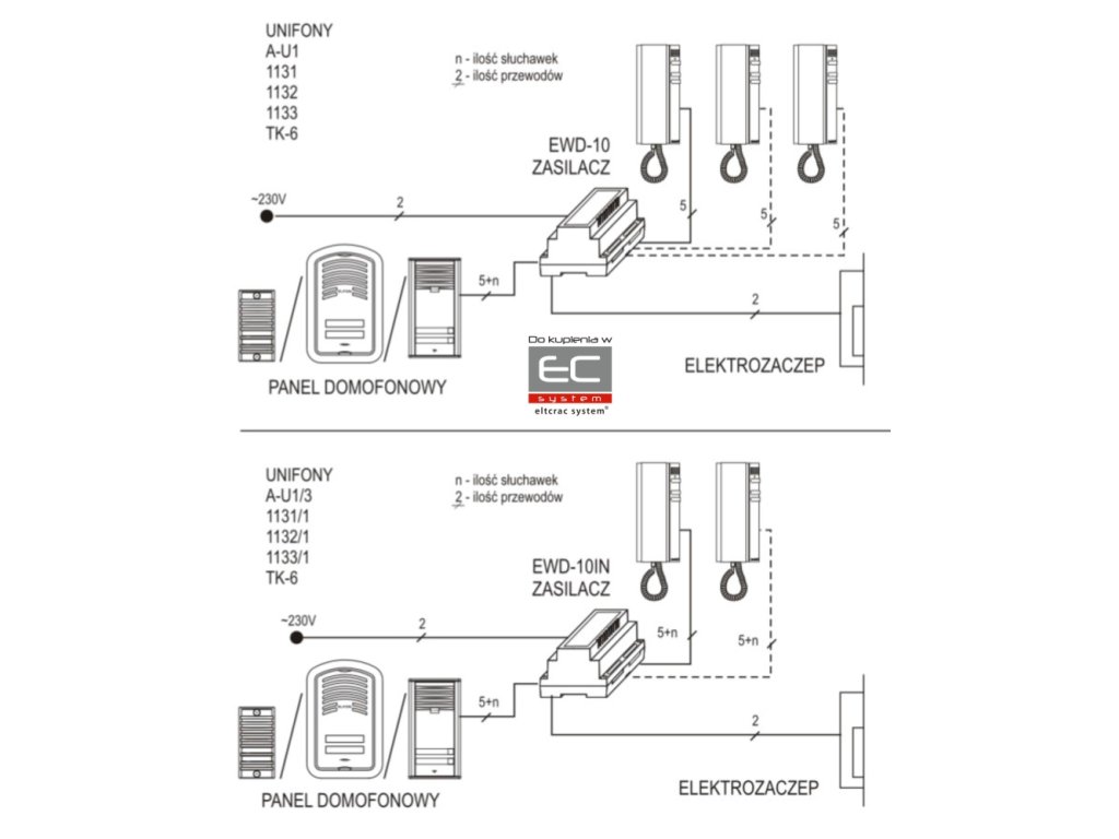 Opis Komplet Pi1 AU1/3 interkom z telefoni A-U1/3 ELFON Uresničuje vse funkcije tipičnega domofona z dodatno možnostjo vodenja "notranjega" pogovora med udeleženci. Komplet domofona vsebuje: 1. Vrata kaseta KDO 1-številčna - dimenzije 81/154/25 mm (širina/višina/globina) - namestitev na površino - osvetljeni gumbi / imenske oznake - mikrofon z gumijastim pokrovom - zvočnik z vodoodporno membrano Kaseta je izdelana iz udarno odporne plastike z vakuumsko prevleko in sprednja plošča iz eloksiranega aluminijastega, kar zagotavlja odpornost proti koroziji in UV žarkom. Uporabljena elektronika zagotavlja optimalno kakovost delovanja naprav v širokem temperaturnem območju. 2. Napajanje interkom EWD 10IN v EURO ohišju s zaščitnim pokrovom dimenzije brez zaščitnega pokrova: - višina 90mm - širina 117mm (6 DIN modulov) - globina 71mm Napajalnik se nahaja v EURO ohišju, namenjenem za namestitev na tirnico v električni omarici, opremljen je z okvirjem, ki pokriva sponke žic. To omogoča varno namestitev napajalnika brez dodatnega ohišja (npr. na steni) 3. Telefon A-U1/3 Elfon x 2 kosi Gre za telefon opremljen z gumbom za odpiranje vrat in dodatnimi 2 gumbi za upravljanje drugih naprav (npr. interkom, vrata). - ohišje telefona je izdelano iz ABS v beli barvi.Additional parameters