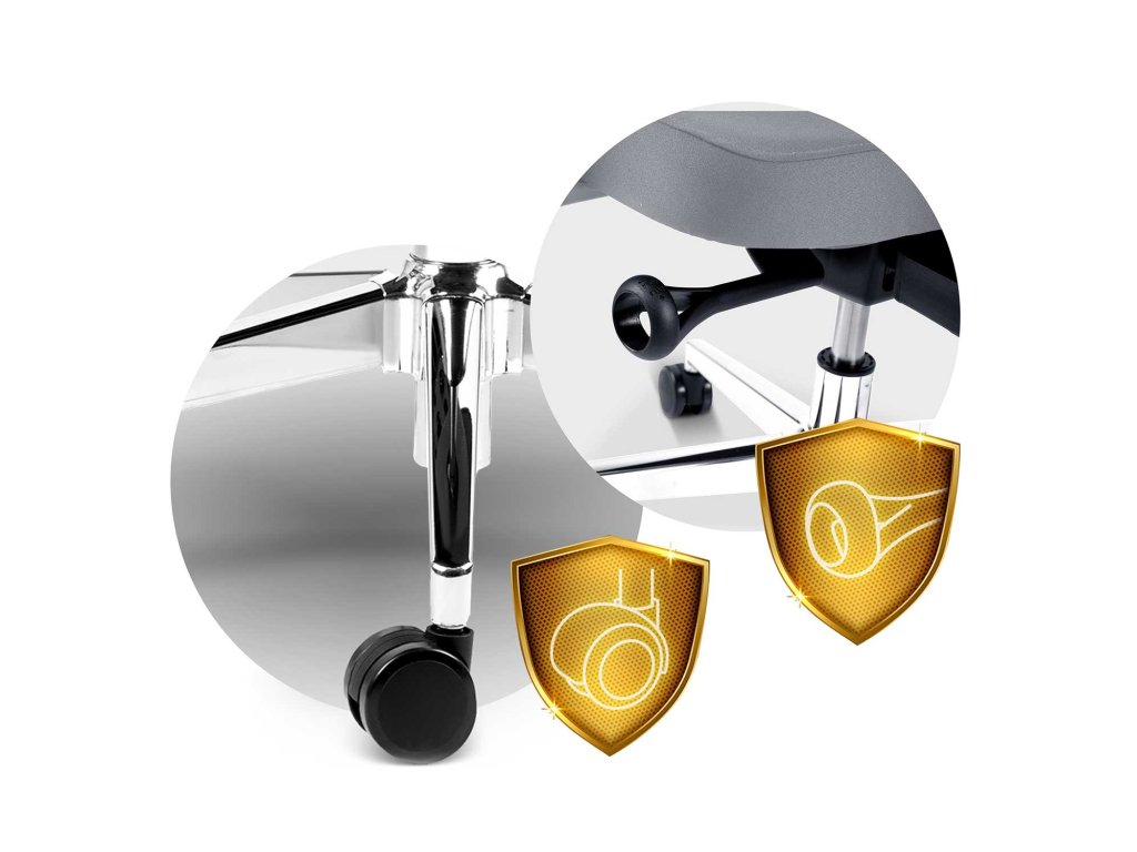 Trdna kovinska osnova je opremljena z najlonsko-gumijastimi kolesi , ki se premikajo tiho in ne opraskajo tal, in eleganten vrtljivi dvižnik omogoča zaklepanje kota naklona v treh pozicijah .