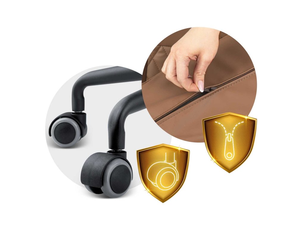 Blazine se lahko iz prevleke odstranijo z všitim zadrgo, robustna kovinska osnova pa je opremljena z najlonsko-gumijastimi kolesci, ki tiho premikajo in ne praskajo tal.