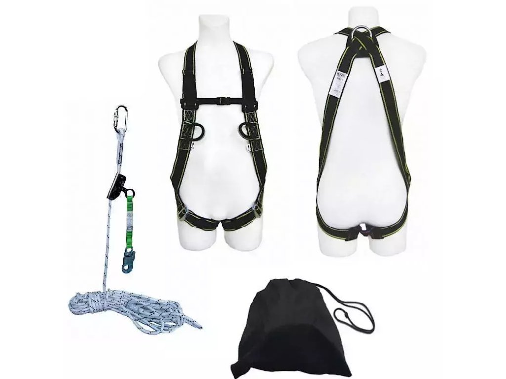 Strešna delovna garnitura BHSZ13 sestavlja enodelni varnostni pas, 15-metrsko varnostno vrv in samozatezni varovalni sistem.