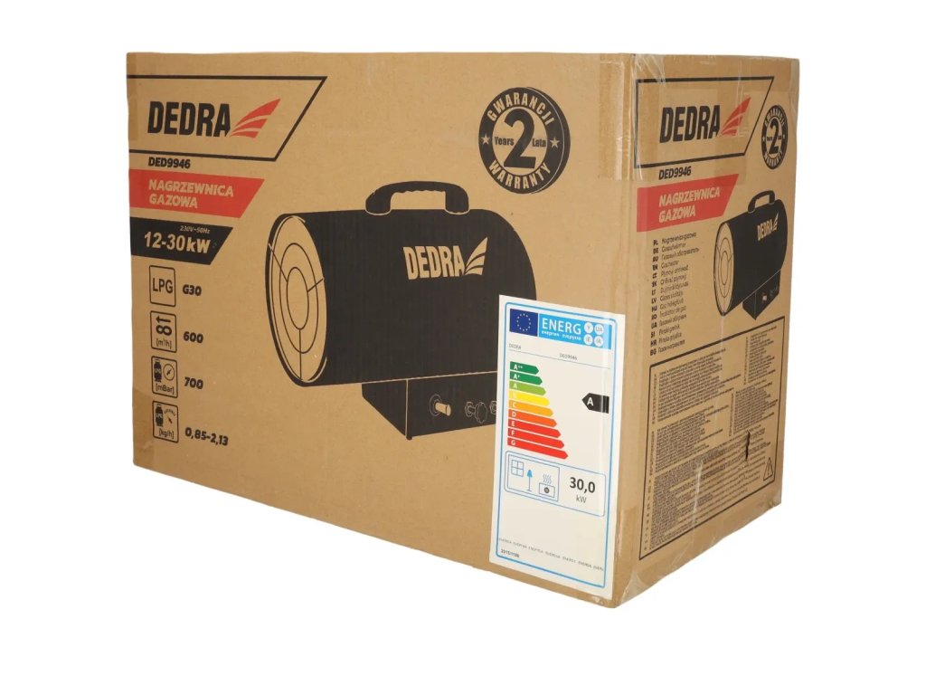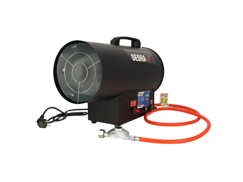 Plinski grelec DED9946 je namenjen uporabi v z a p r t i h prostorih. Uporablja se za ogrevanje neogrevanih prostorov, kot so delavnice, skladišča, proizvodne hale, rastlinjaki ali pri gradbenih delih. Grelnik deluje na propan-butan (G30). Naprava se sme uporabljati samo v dobro prezračevanih prostorih. Kovinsko ohišje se ne segreva niti med daljšim delovanjem. Kovinsko ohišje se ne segreva niti med dolgim časom. Komplet vsebuje poseben regulator in cev. Ročaj iz soli omogoča enostavno prenašanje in transport.Ta izdelek se ne sme uporabljati kot primarni vir ogrevanja.
