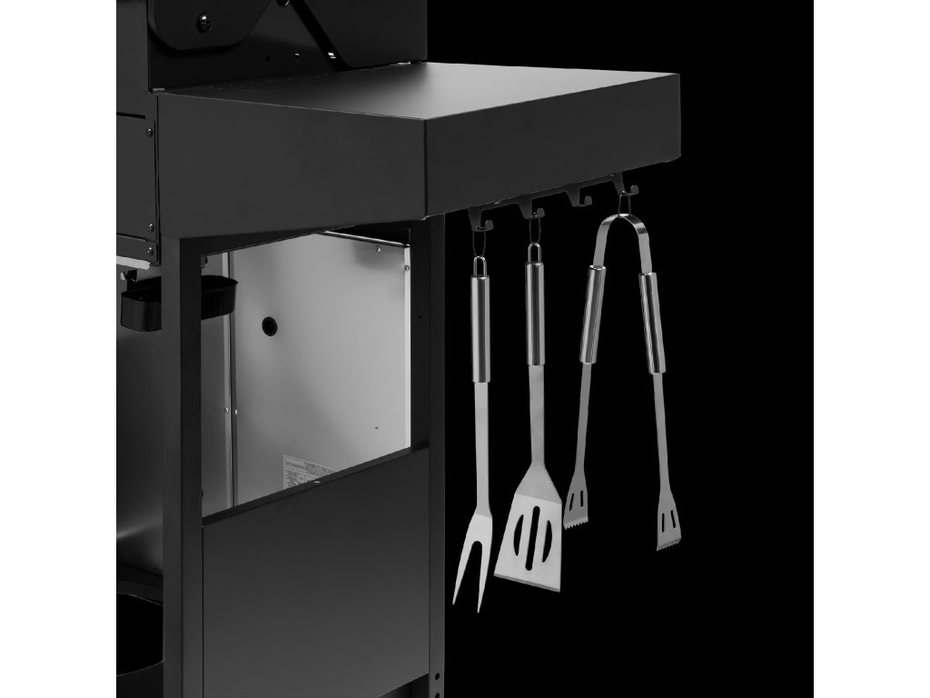 Žar Teesa BBQ 5007 MASTER ne ponuja le moči in udobja pri pečenju, temveč tudi premišljene organizacijske rešitve. Omarica za tlačno posodo omogoča varno in estetsko shranjevanje plina, štirje kavlji pa olajšajo dostop do dodatkov. Tako imate vse potrebne elemente vedno pri roki, kar povečuje udobje uporabe.